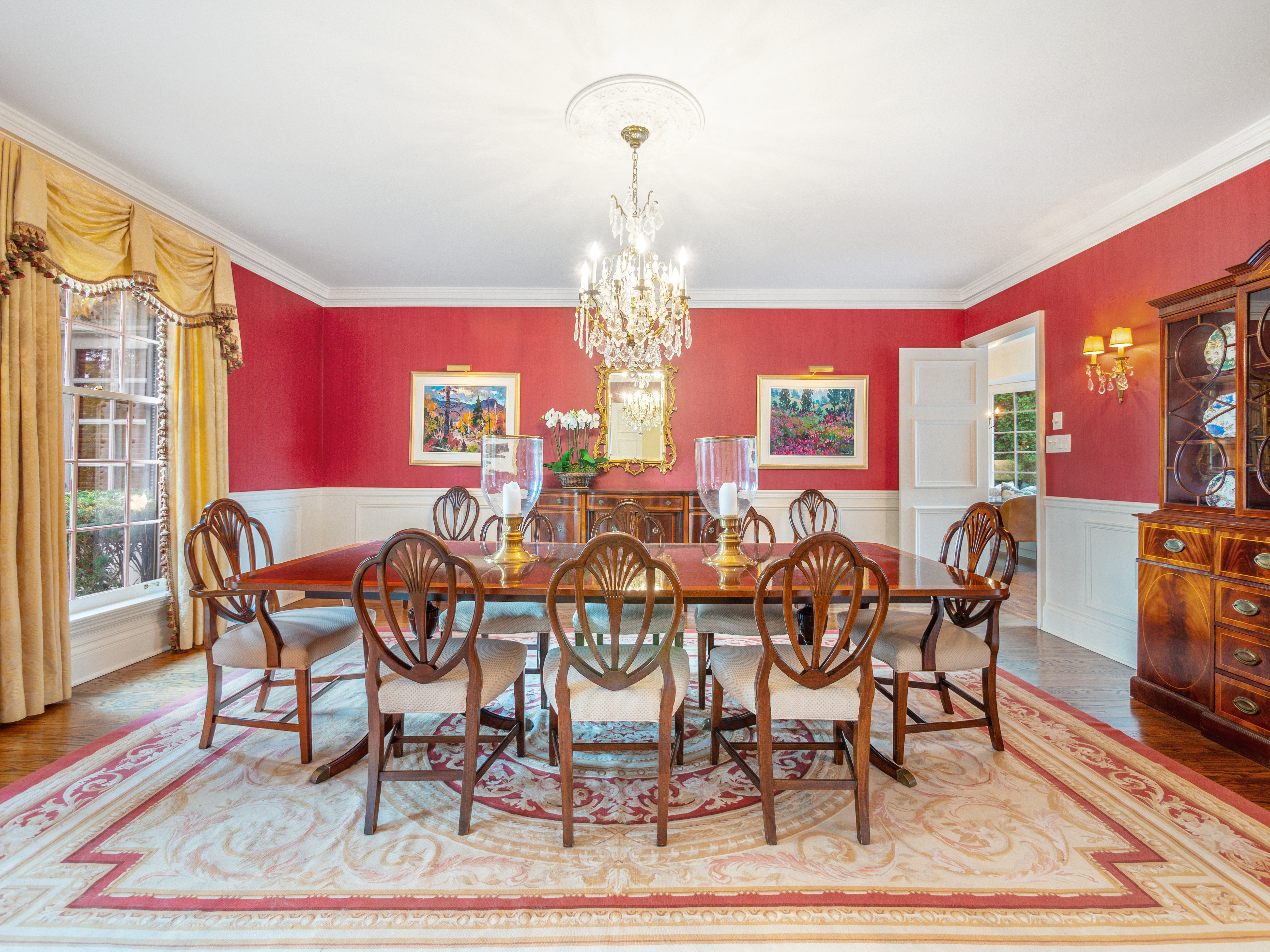 patio. The formal dining room has a similar aesthetic with rich hardwood floors, wainscotting