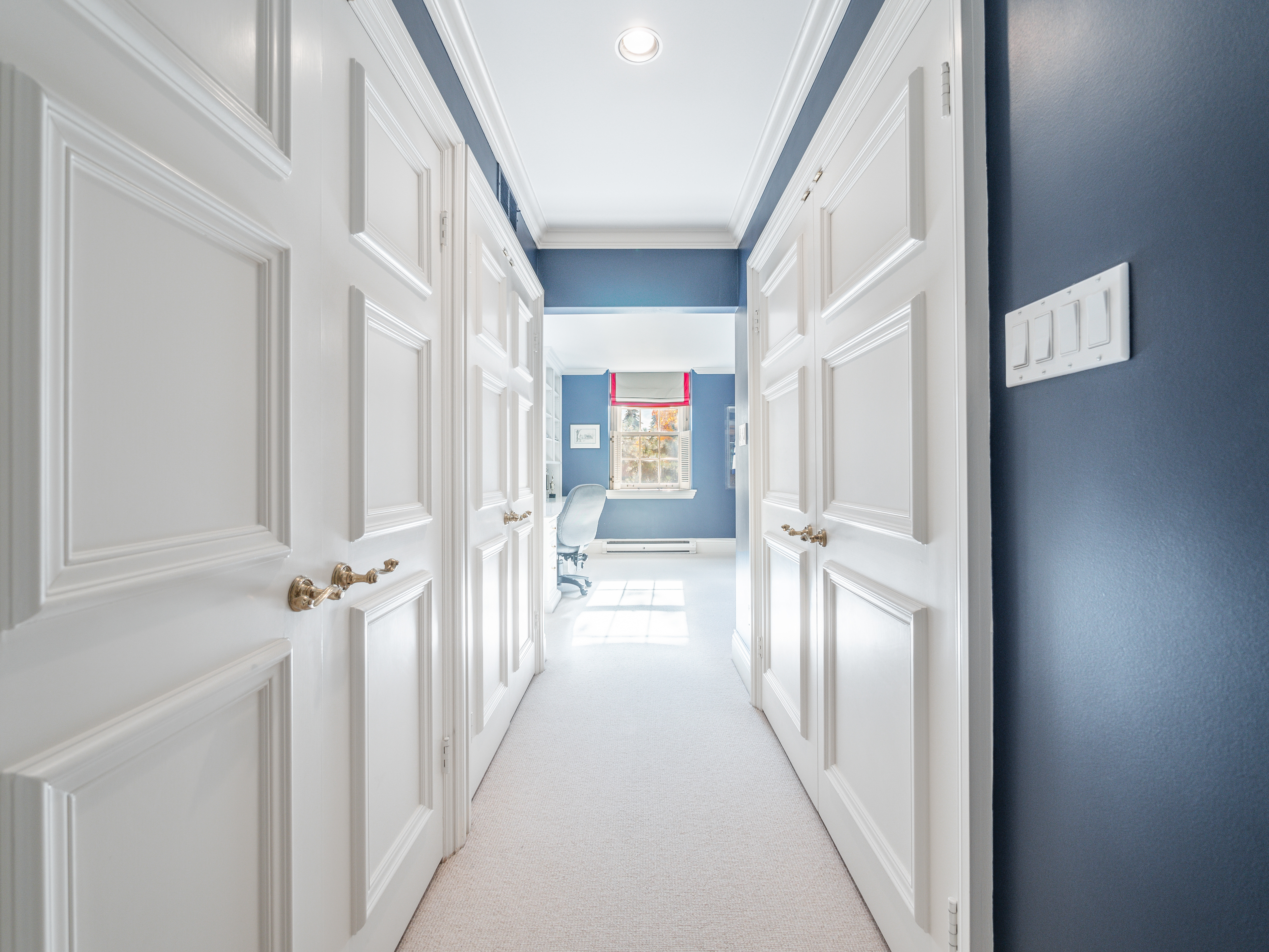 oak hardwood floor in the hallway, which leads to a perfectly positioned powder room. The
