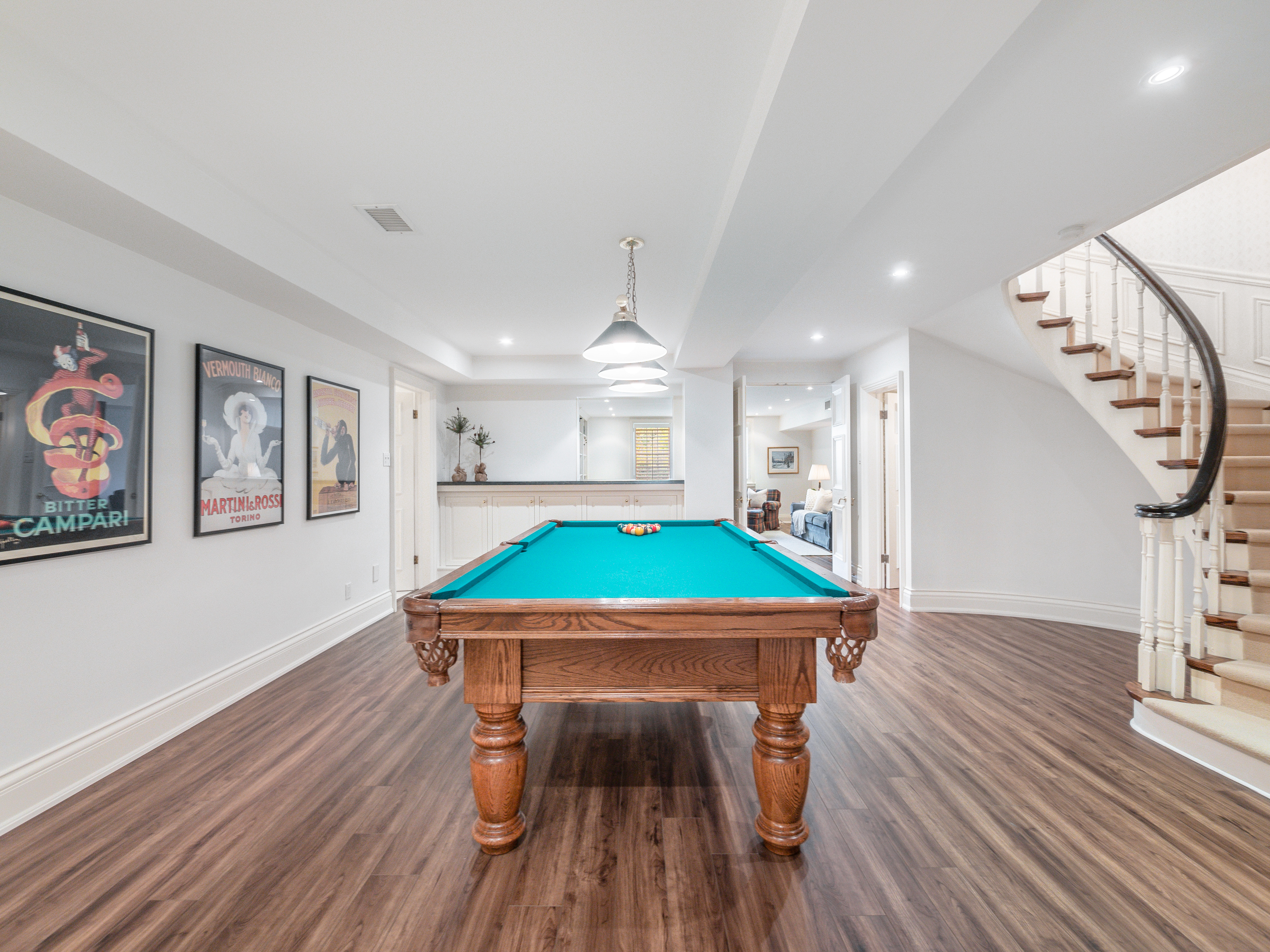 light through the massive above grade windows and a cozy fireplace. The current games room
