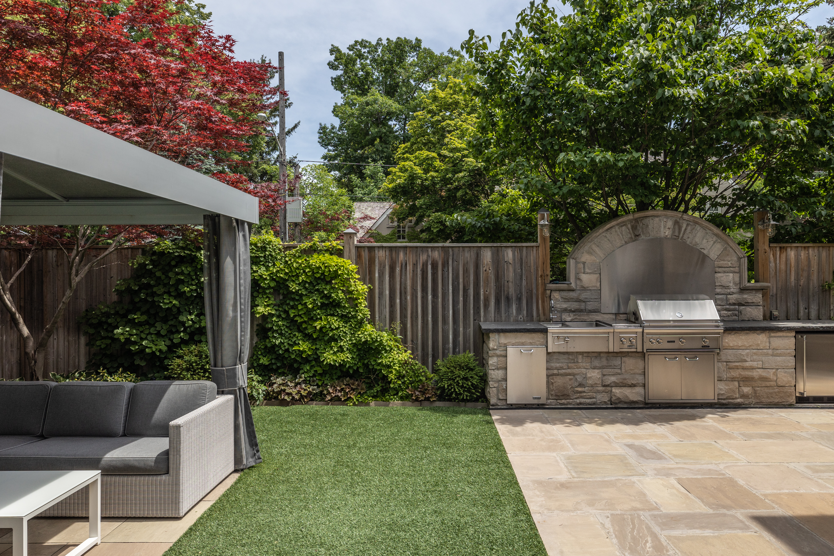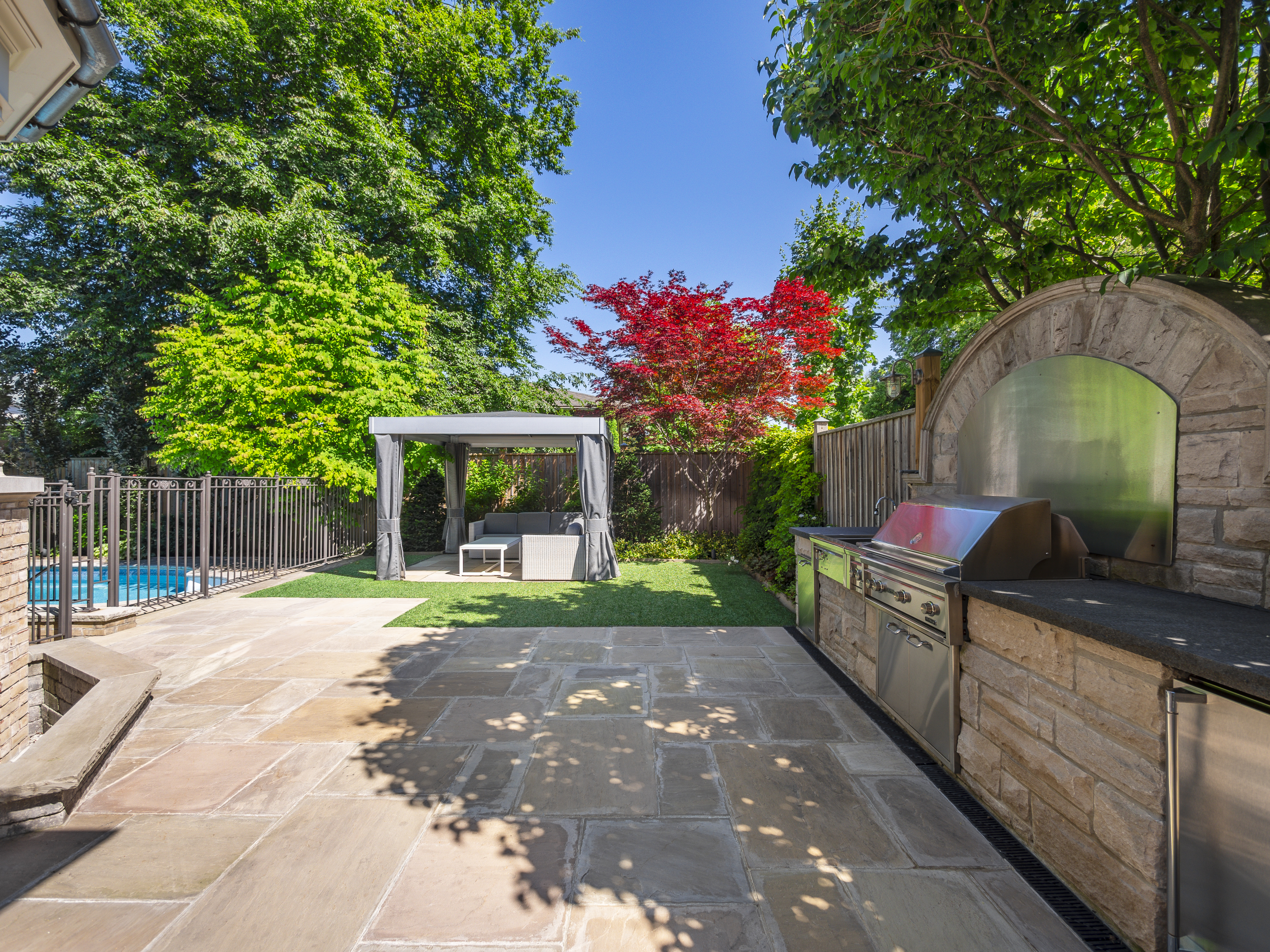 Step outside to the backyard oasis. Five star outdoor entertaining in the summer is a breeze. The kids can keep active in the swimming pool, while the adults can relax poolside on the flagstone patio/sundeck. There is no need to leave the party. This backyard is equipped with a functional outdoor kitchen offering a grill surface, beverage fridge and outdoor sink. The mature trees surround this fully fenced backyard and add privacy and tranquility. Parking is not an issue. The double driveway can park four cars in addition to the garage.