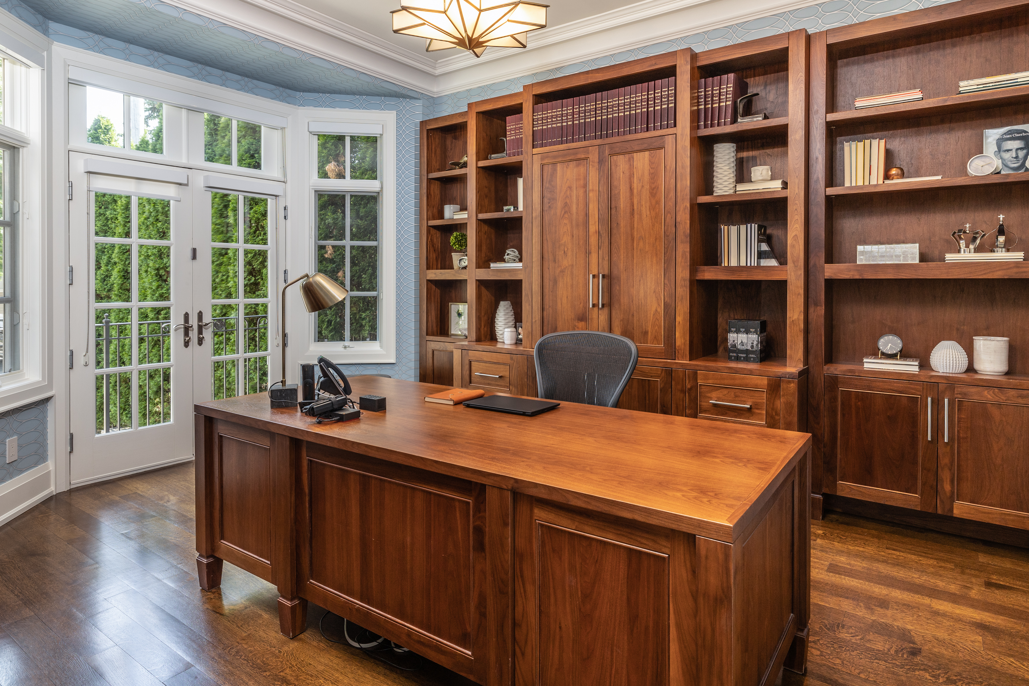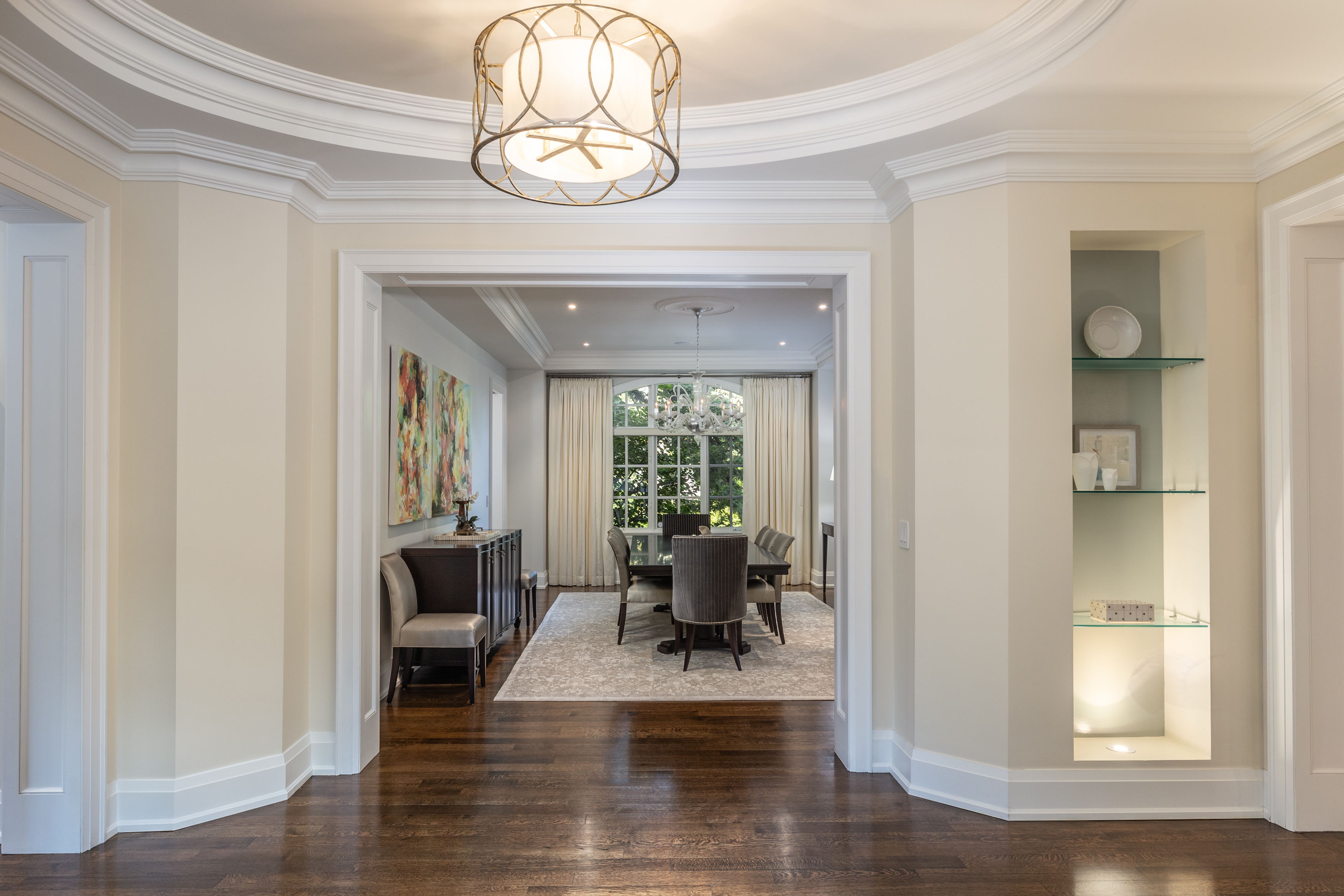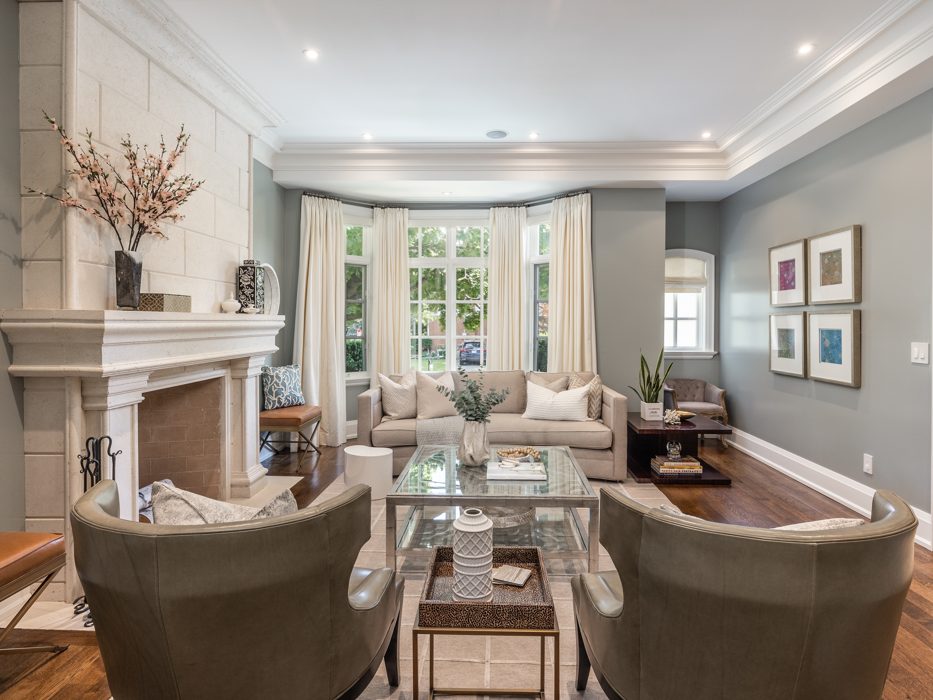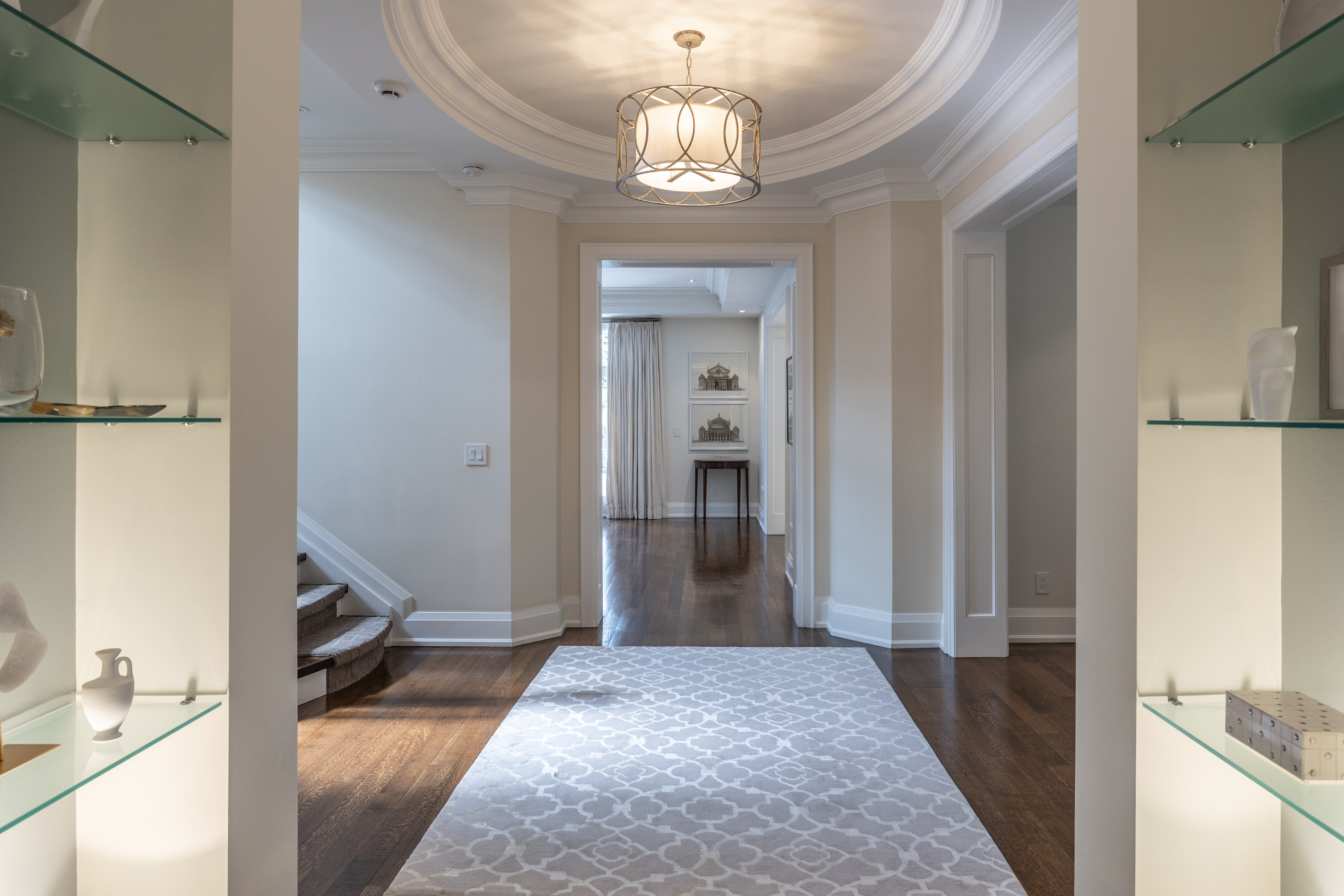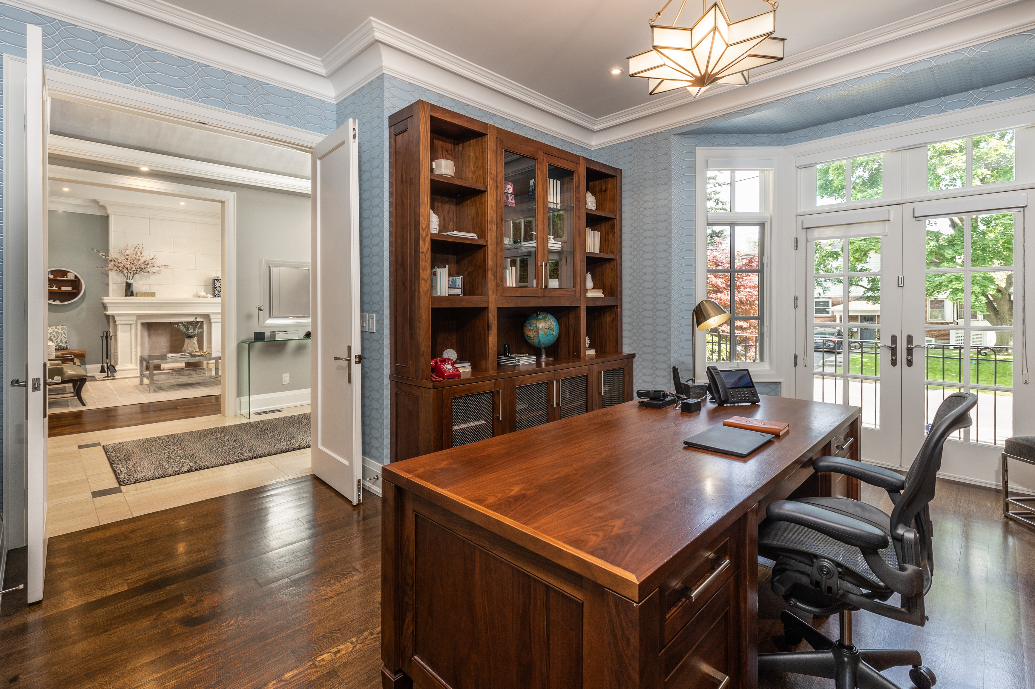 Come inside for a peak! The front foyer is most welcoming and perfectly flanked by the formal living room and private library. The library is a special place and currently used as a home office. The rich walnut built-in shelves, designer wallpaper and a french door walk-out to the south facing front terrace. This room has a sophisticated feel and pleasant ambiance for the current work culture that embraces working from home.