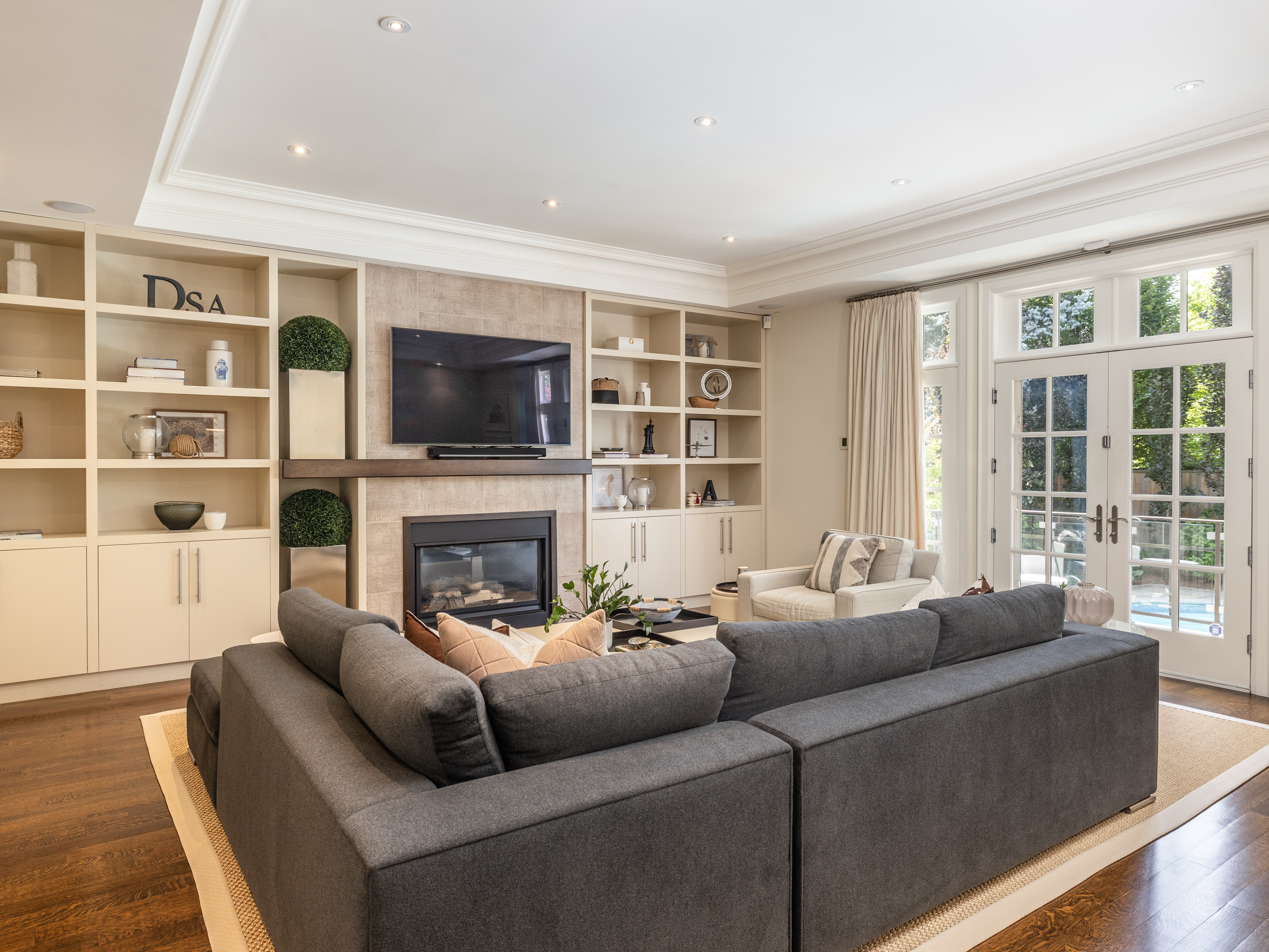 Integral to easy family life and the heart of the home is the open concept kitchen and family room. This casual space lends itself perfectly to everyday living. The custom crafted kitchen is restaurant inspired and comes with top-of-the-line integrated appliances, granite countertops and a large centre island with breakfast bar. Meals can be enjoyed in the cozy alcove overlooking the backyard and pool. The family room is open to the kitchen and offers a spacious and comfortable place for family hangouts. The custom entertainment unit and contemporary gas fireplace grounds the room and the back windows, including french door access to the back terrace allows for a spectacular view of the pool and the backyard entertaining space.