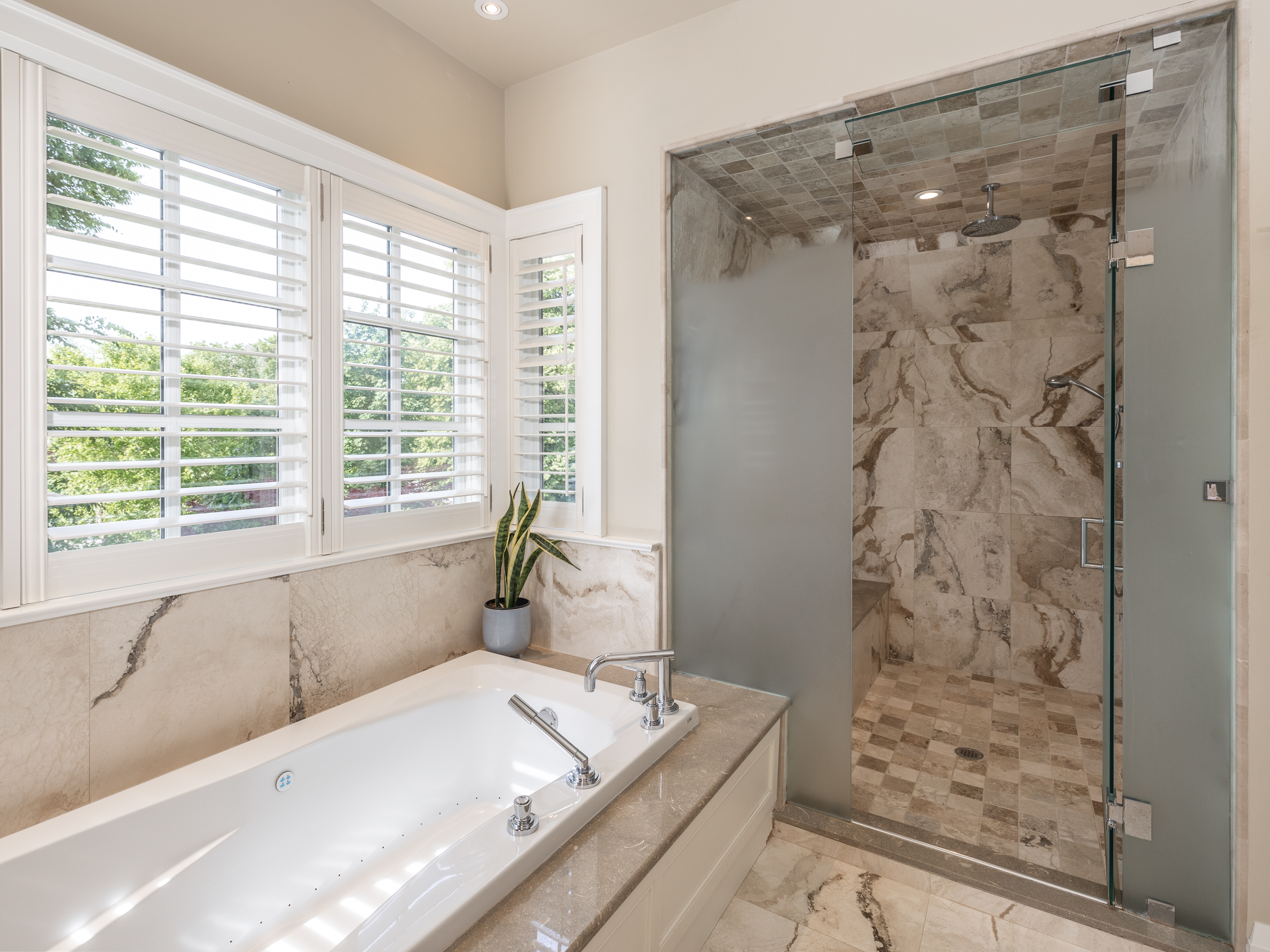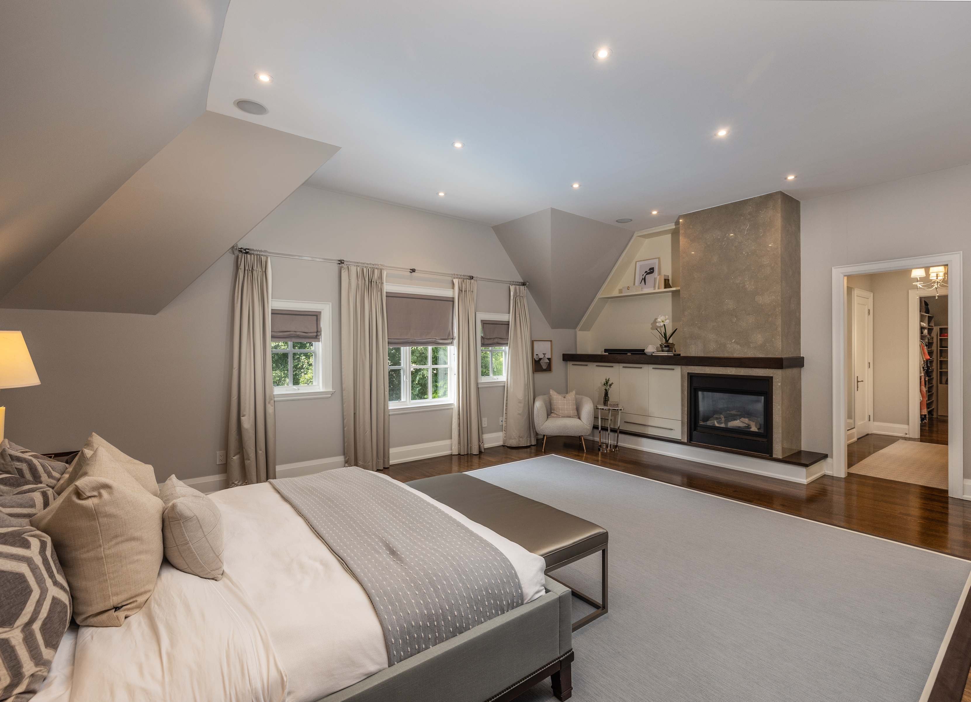 Upstairs, four bedrooms await. The primary suite spans the entire back half of the home. All components of this suite can be considered relaxing. The spacious bedroom features a custom built-in. The cozy gas fireplace adds ambiance and the built-in speakers can set the mood. The dressing room that separates his and hers walk-in closets includes a rare make-up vanity, glass cabinets and built-in drawers. The sprawling 6-piece ensuite offers neutral finishes and quality materials. The heated marble floors warm the feet. A standalone air-jet bathtub, glass enclosed steam shower, double vanity and a private toilet closet add to the functionality of the primary ensuite bathroom.