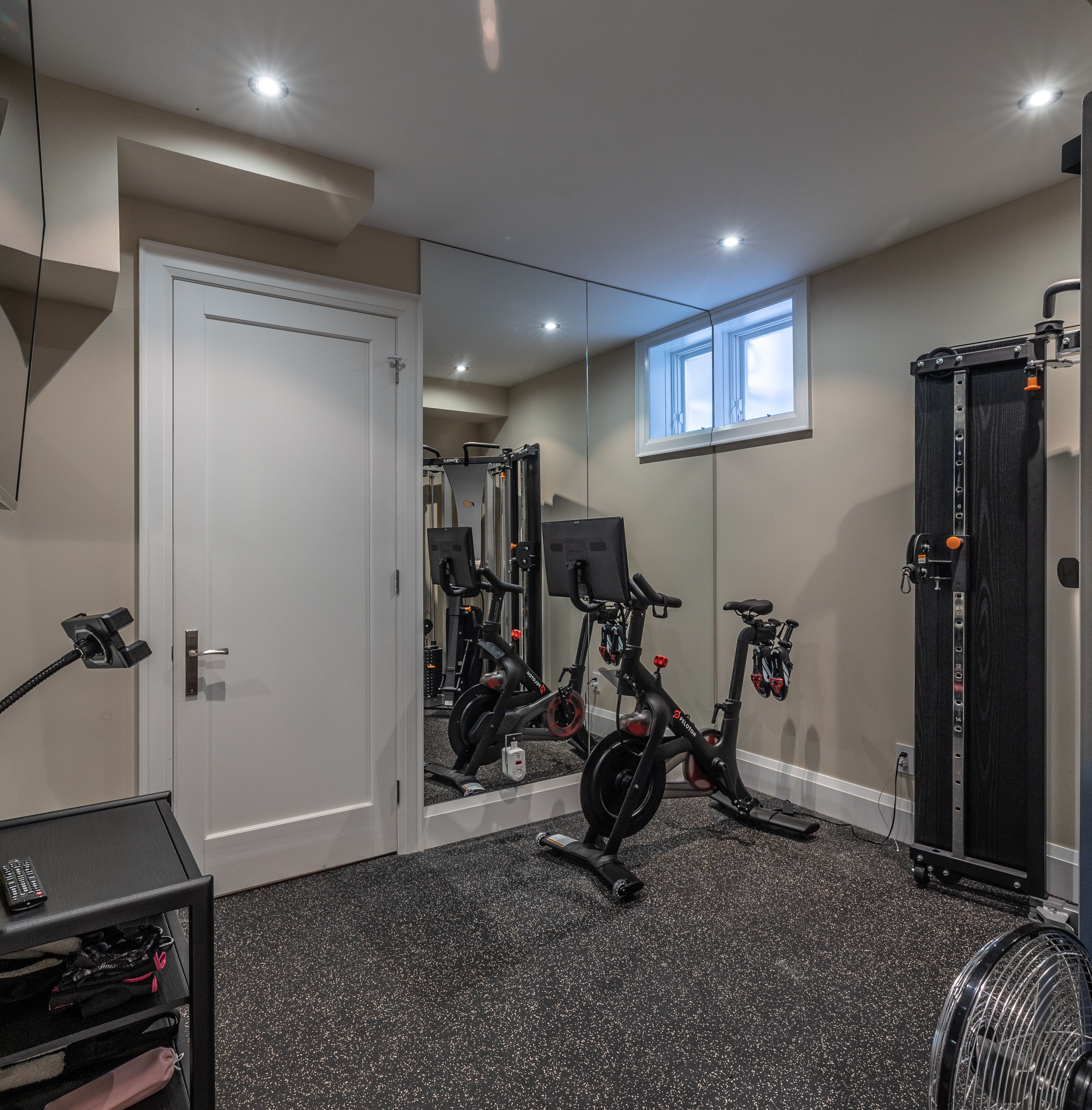 More than ever, health and fitness is important. Just off the recreation room is a dedicated home gym fitted with classic mirrored walls and rubberized flooring. There is even a cedar sauna to relax sore muscles after the gym.