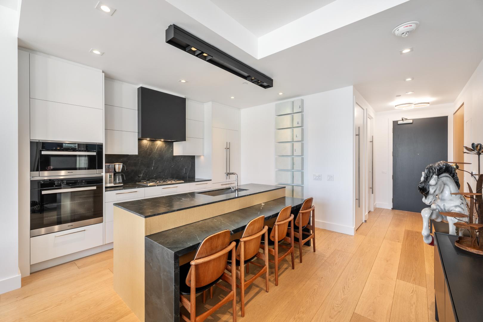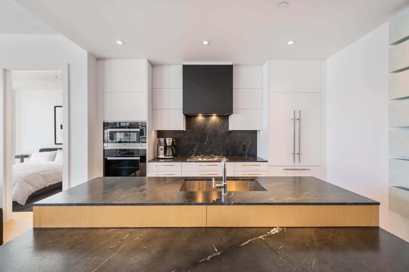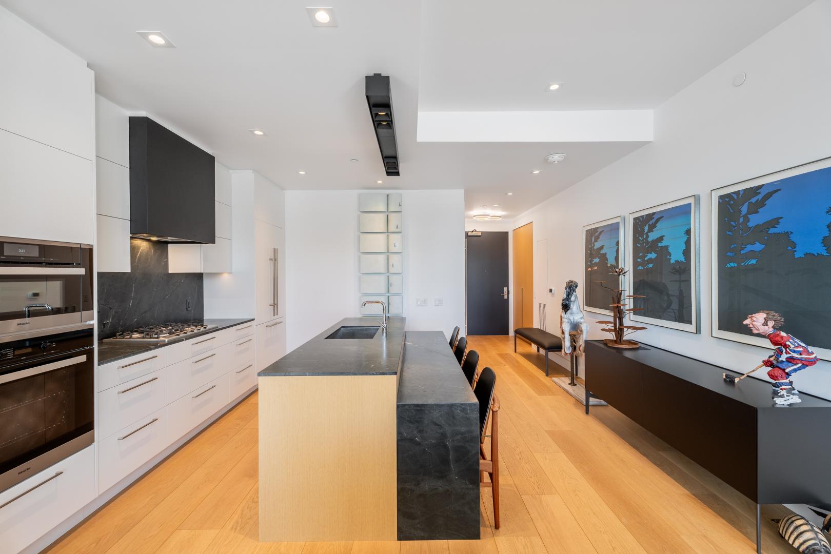 The living room is saturated by natural light that streams in from the floor to ceiling windows that includes a walkout to the balcony with full size gas BBQ. This room also features pot lights and automatic window coverings. The living room is open to the kitchen. The Bellini cabinetry extends to the ceiling and top of the line Miele appliances include a gas cooktop, speed oven/microwave along with a conventional oven and dishwasher. The dark stone countertops have been leathered adding warmth and texture. Even the centre island has an attached breakfast table fabricated in the same leathered stone for casual dining.