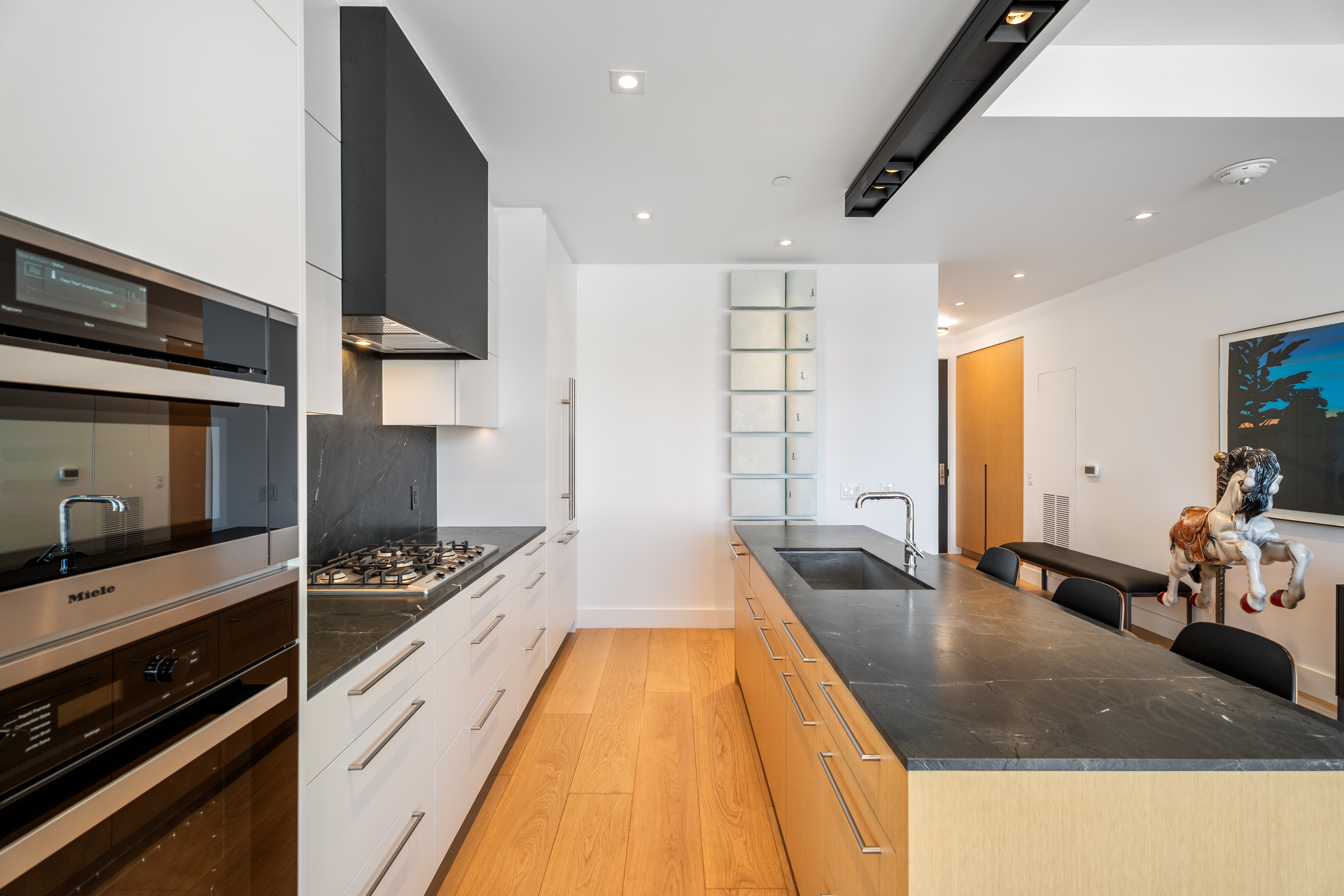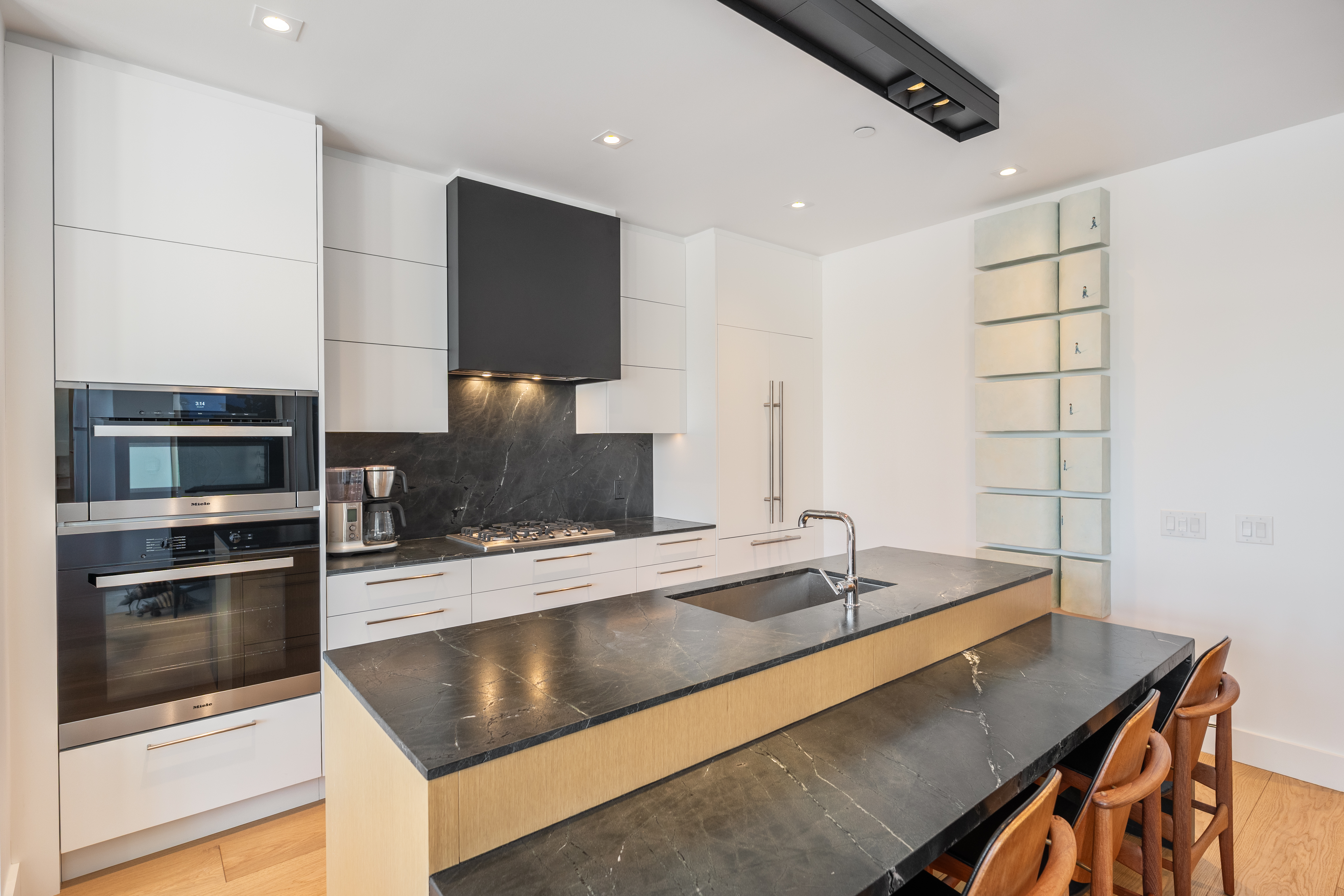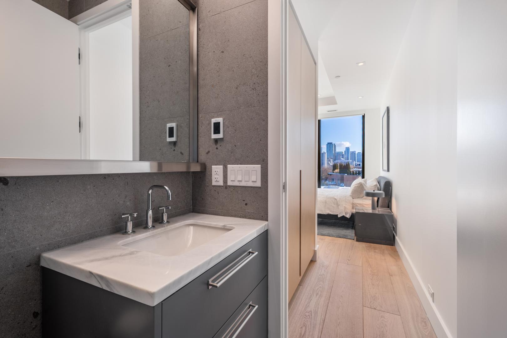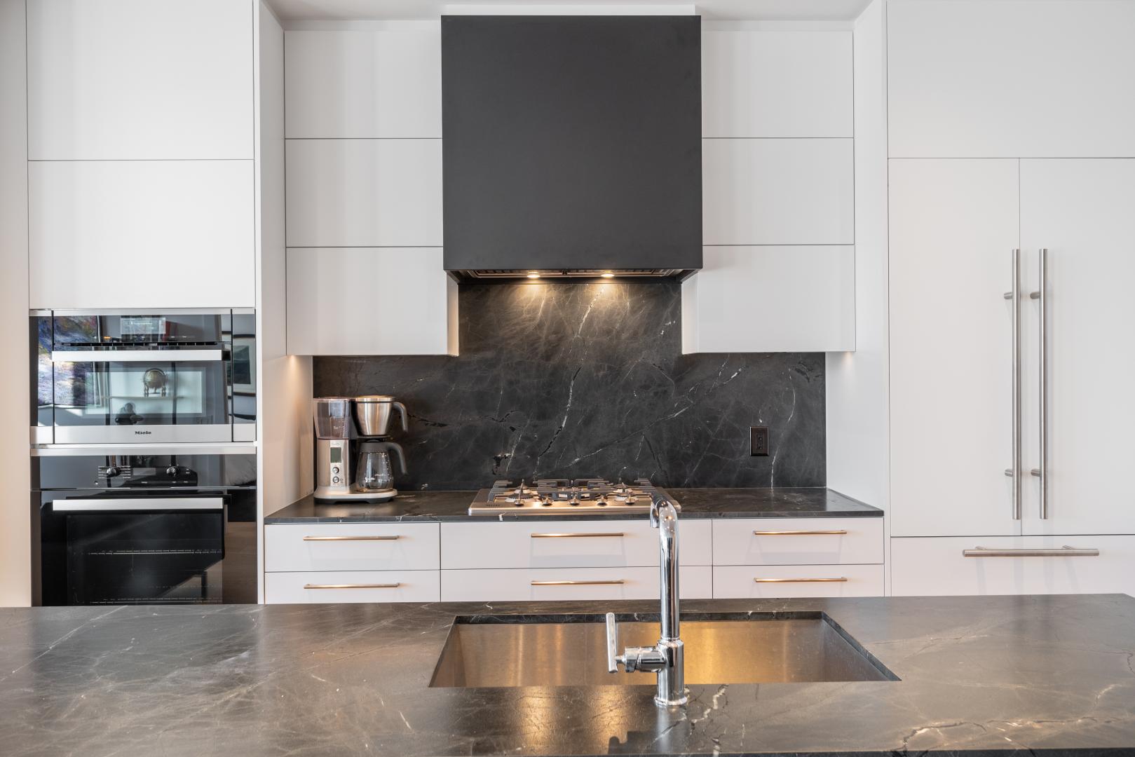 The living room is saturated by natural light that streams in from the floor to ceiling windows that includes a walkout to the balcony with full size gas BBQ. This room also features pot lights and automatic window coverings. The living room is open to the kitchen. The Bellini cabinetry extends to the ceiling and top of the line Miele appliances include a gas cooktop, speed oven/microwave along with a conventional oven and dishwasher. The dark stone countertops have been leathered adding warmth and texture. Even the centre island has an attached breakfast table fabricated in the same leathered stone for casual dining.