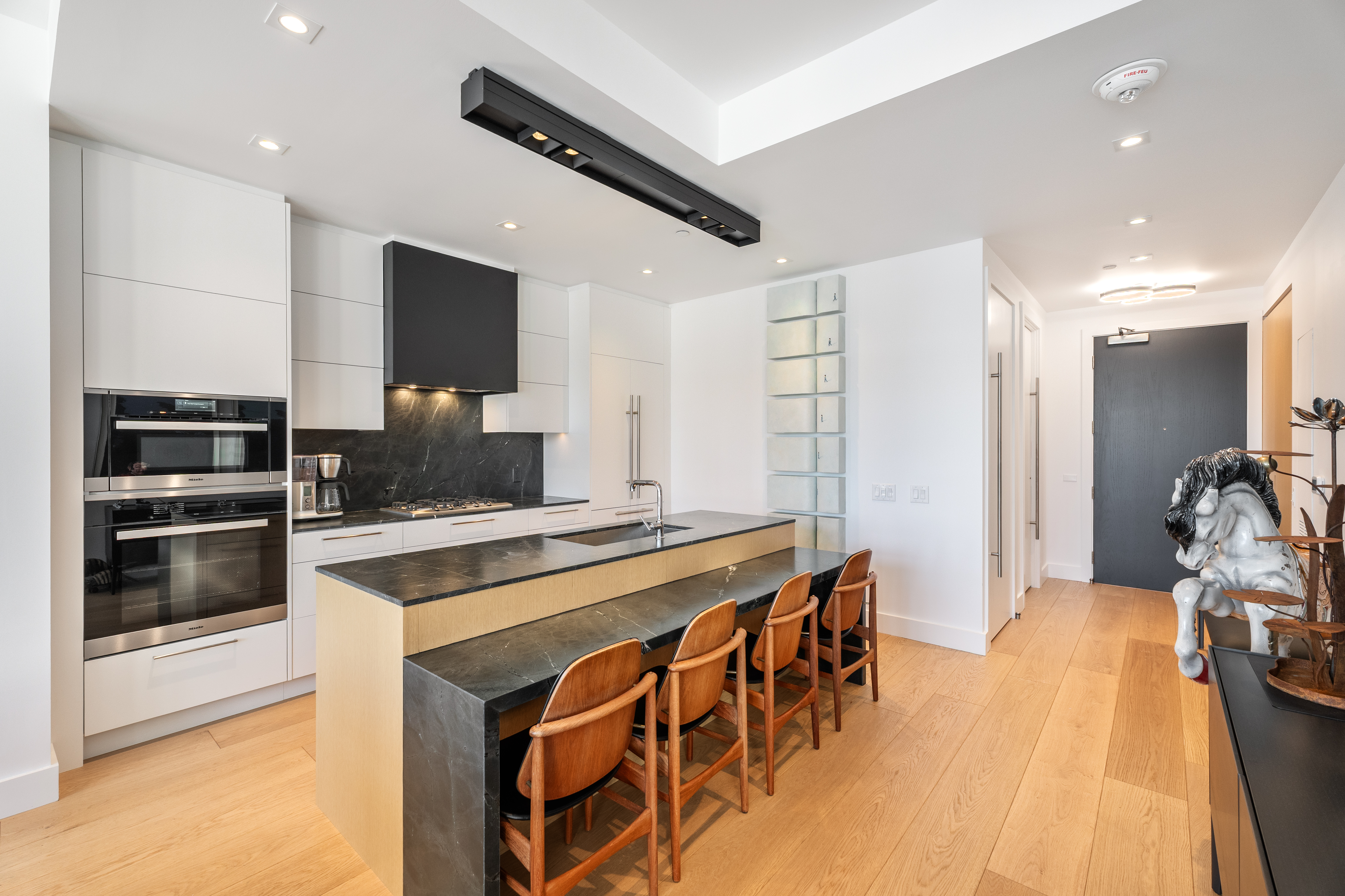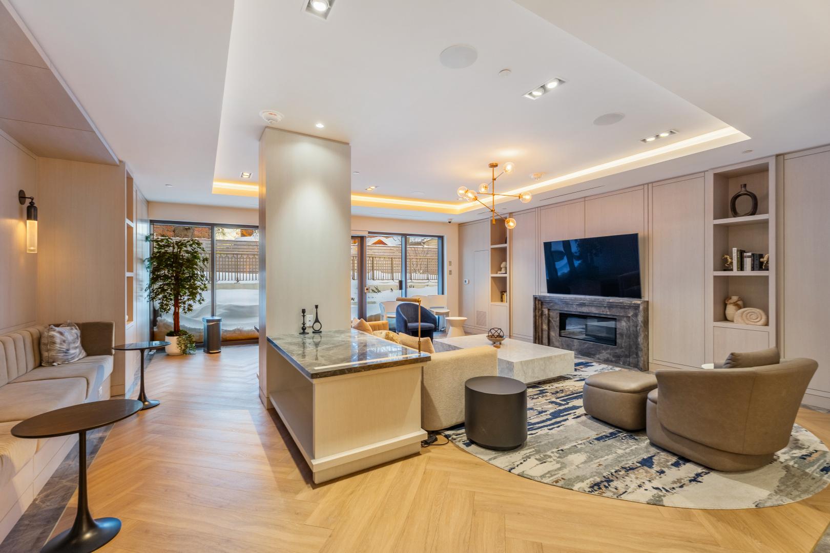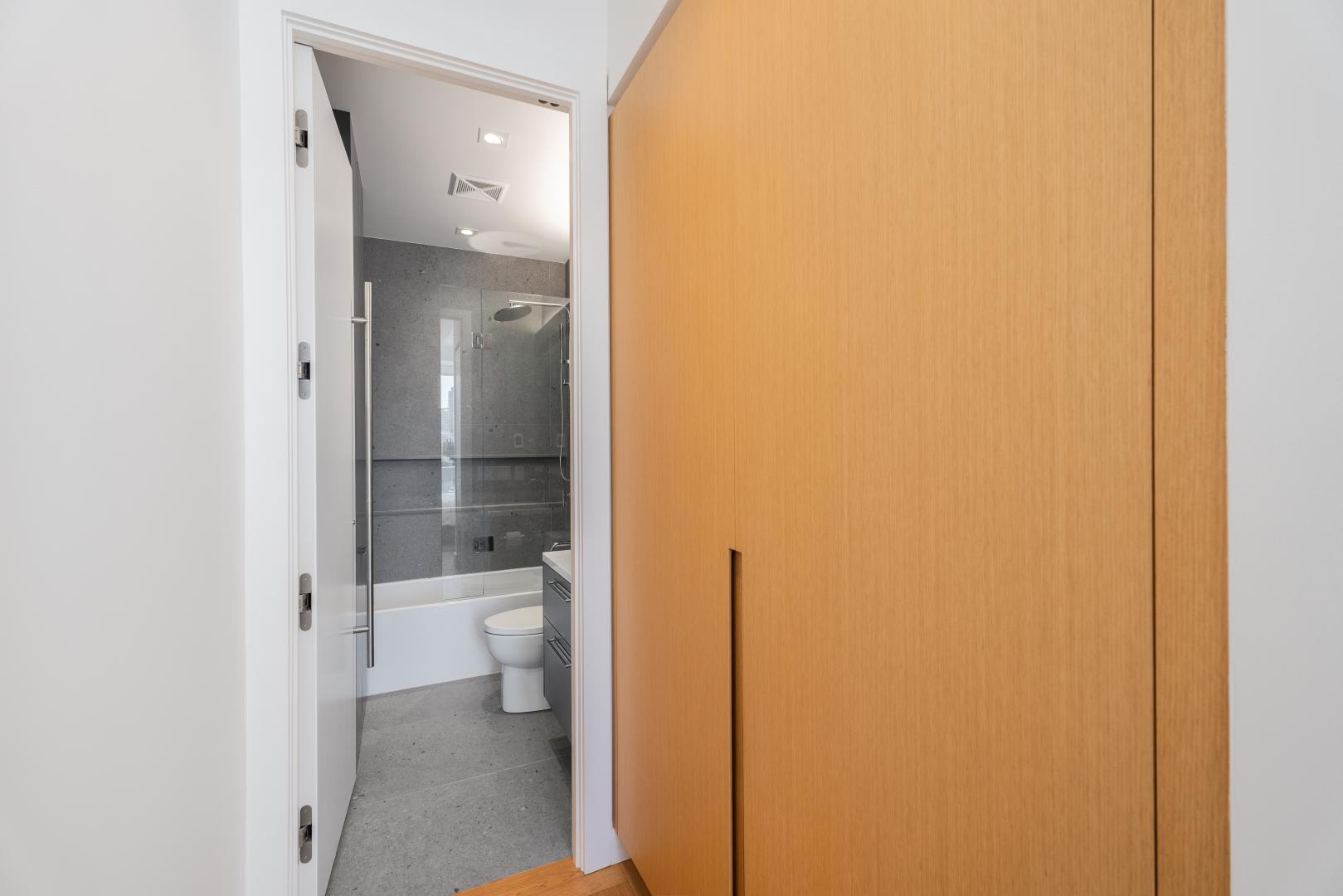 At first glance, marvel at the south facing floor to ceiling windows, 10’ ceilings, 10” plank white oak floors, quality stone work and custom cabinetry by Bellini. The foyer has a built-in wood clad closet and the powder room is perfectly positioned. This 2-piece bathroom has been exquisitely finished with high gloss textured subway tile stonework, laid in a herringbone pattern and there is a beautiful statement vanity.