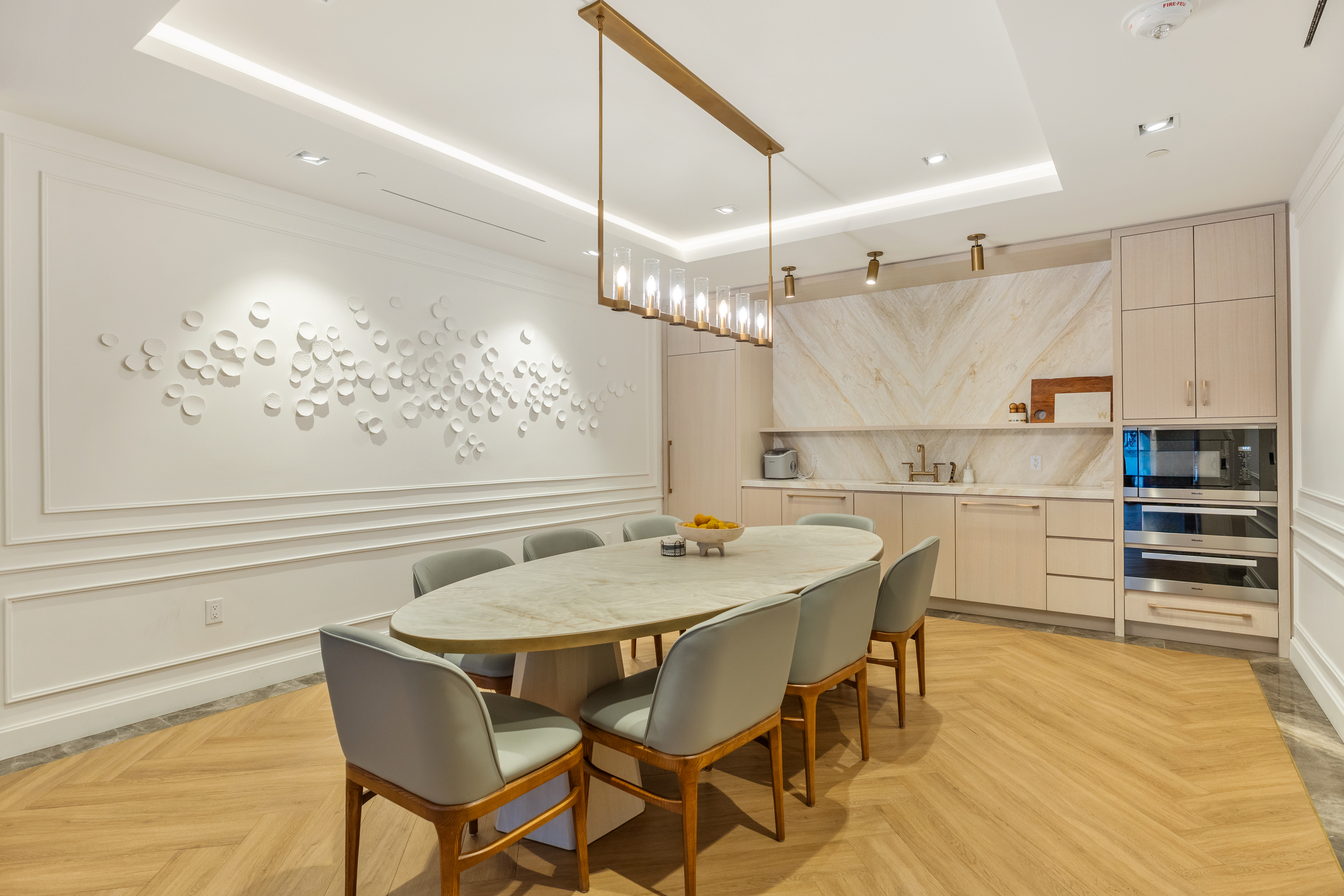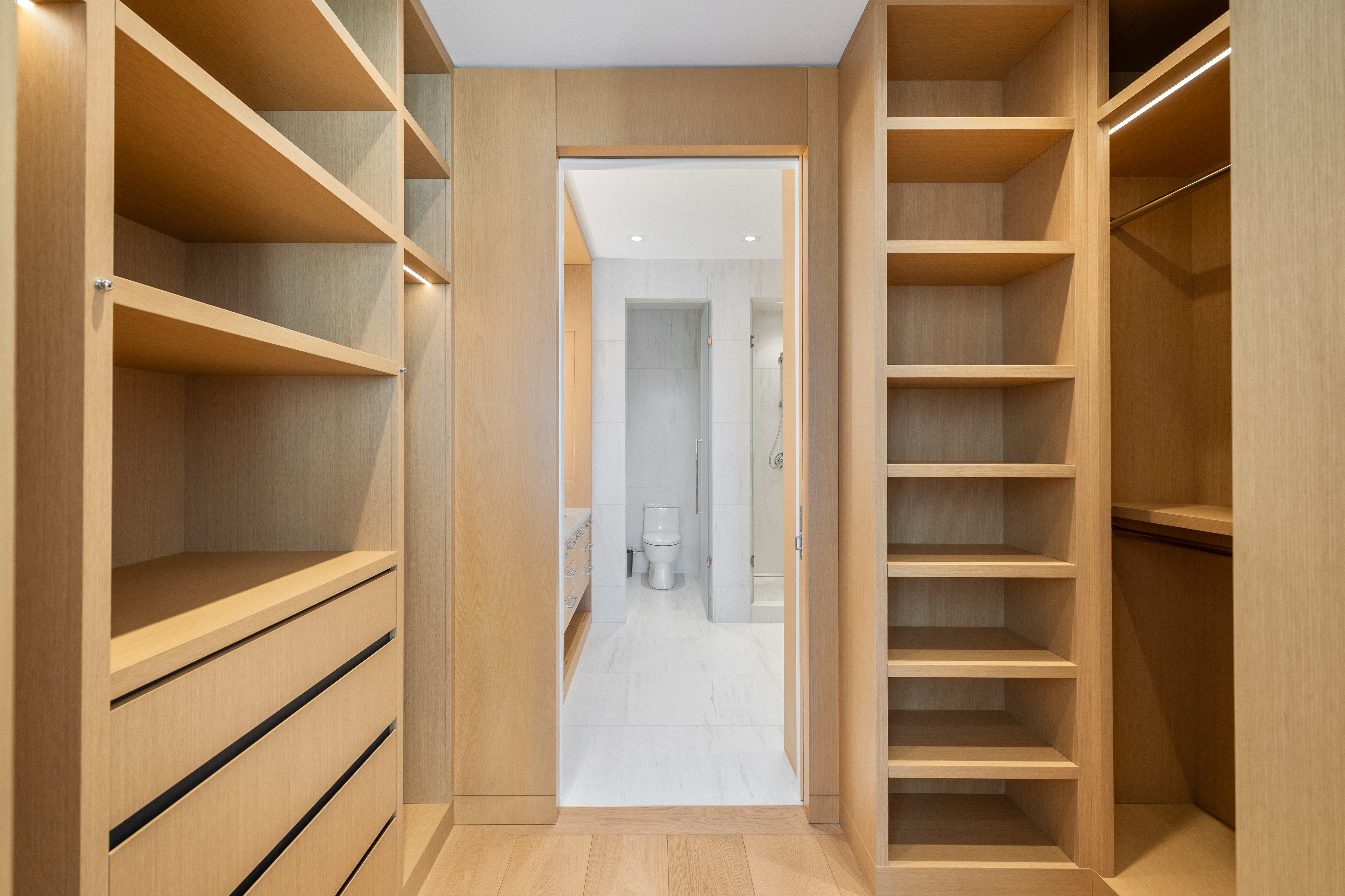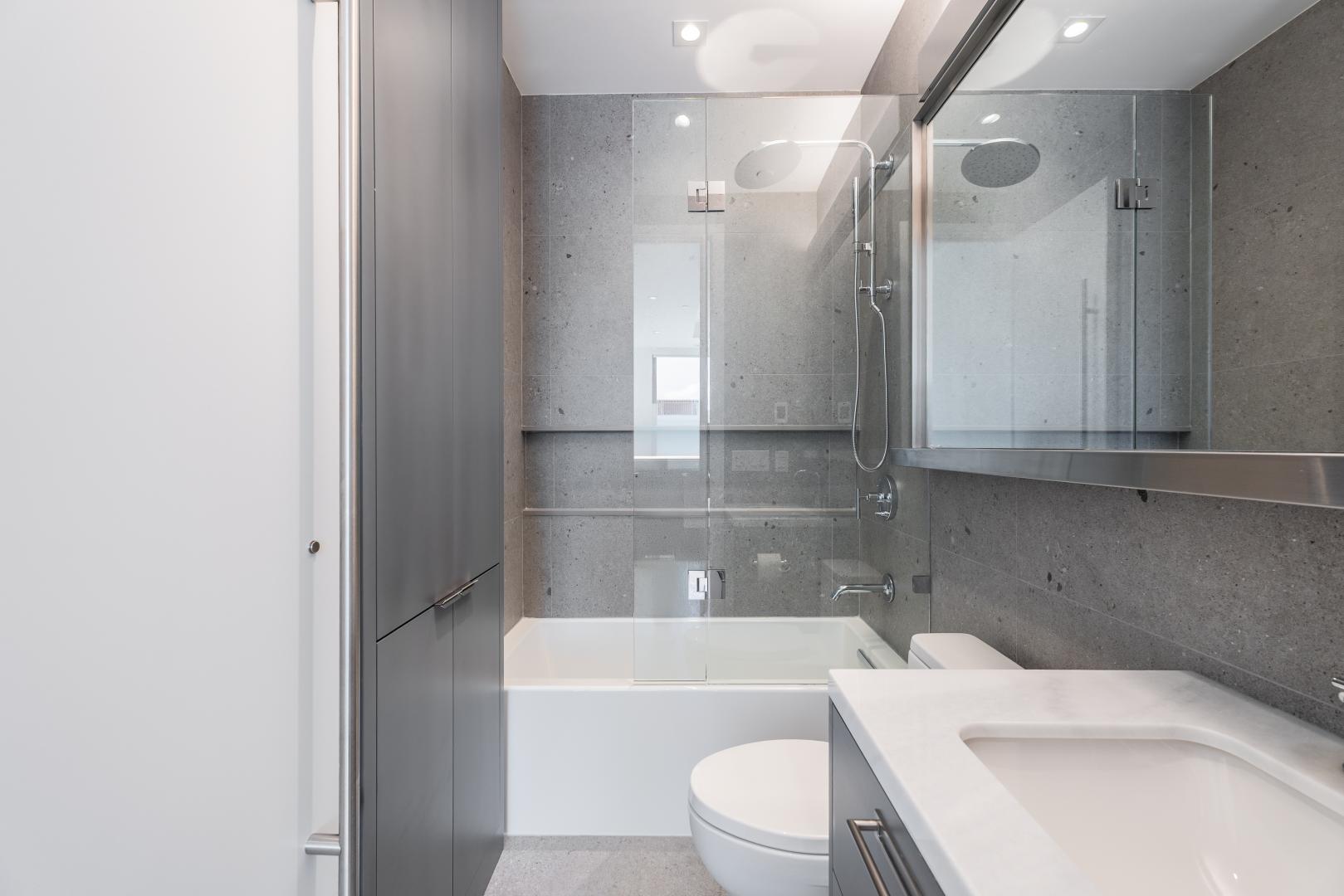 At first glance, marvel at the south facing floor to ceiling windows, 10’ ceilings, 10” plank white oak floors, quality stone work and custom cabinetry by Bellini. The foyer has a built-in wood clad closet and the powder room is perfectly positioned. This 2-piece bathroom has been exquisitely finished with high gloss textured subway tile stonework, laid in a herringbone pattern and there is a beautiful statement vanity.