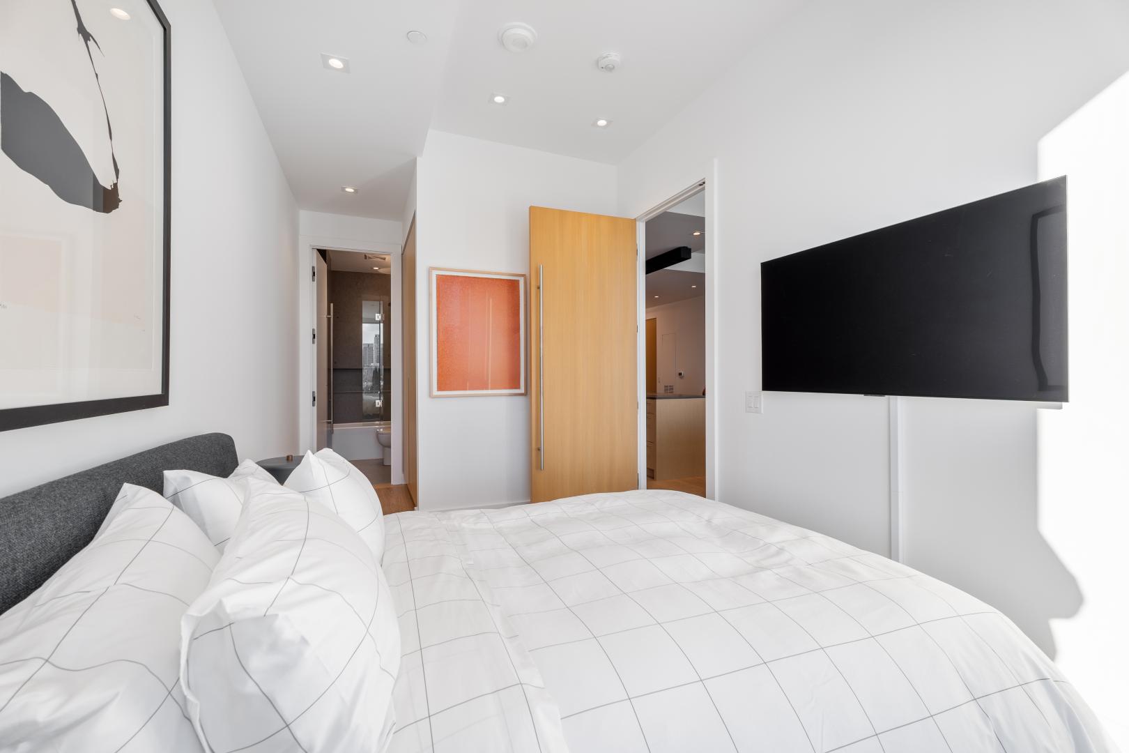 On the other side of the living room is a spacious second bedroom that includes a wall of built-in closet storage and a 4-piece ensuite bathroom. Again, note the timeless choice of finishes throughout. Completing the interior space is a full sized laundry closet. The rare top loading washer and front loading dryer, along with the extra floor space are highly coveted in condo living.