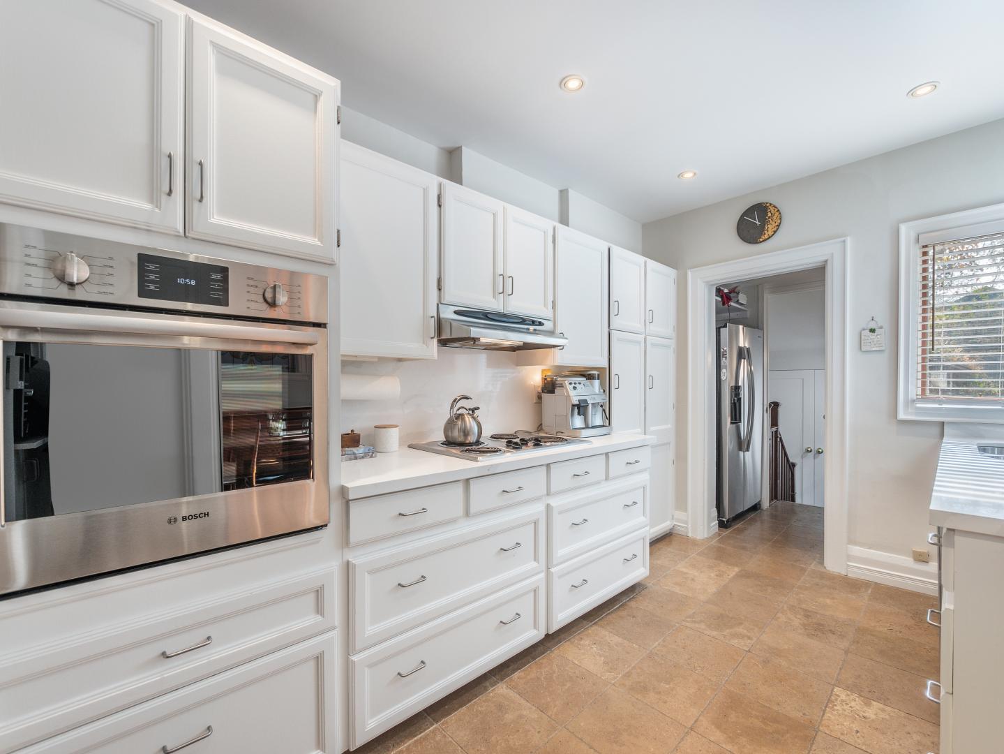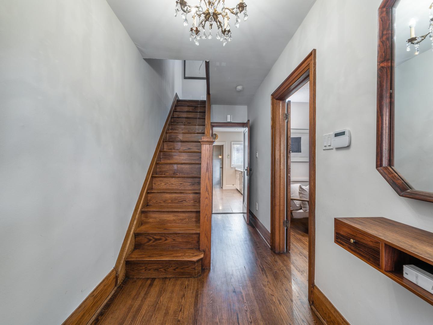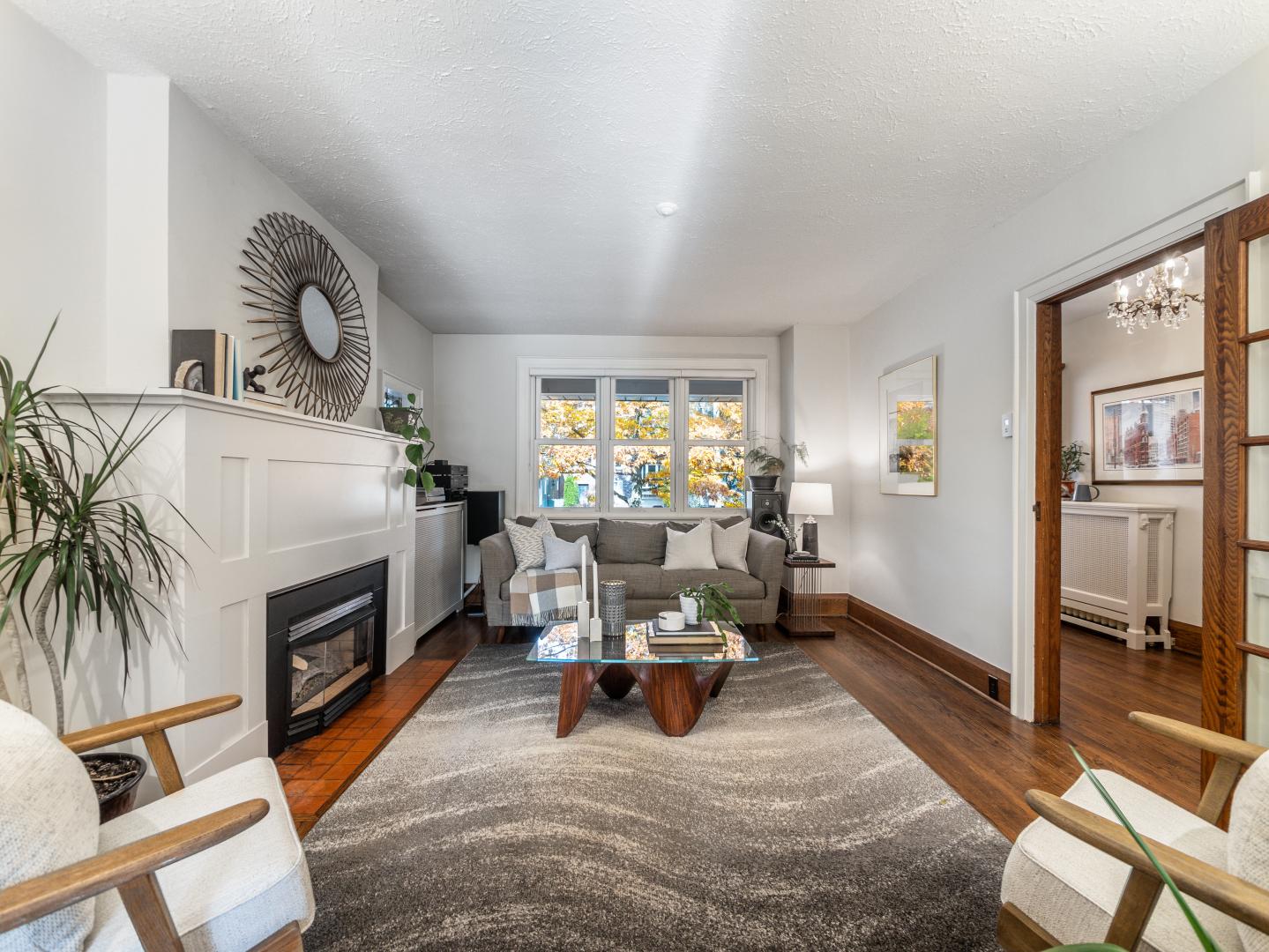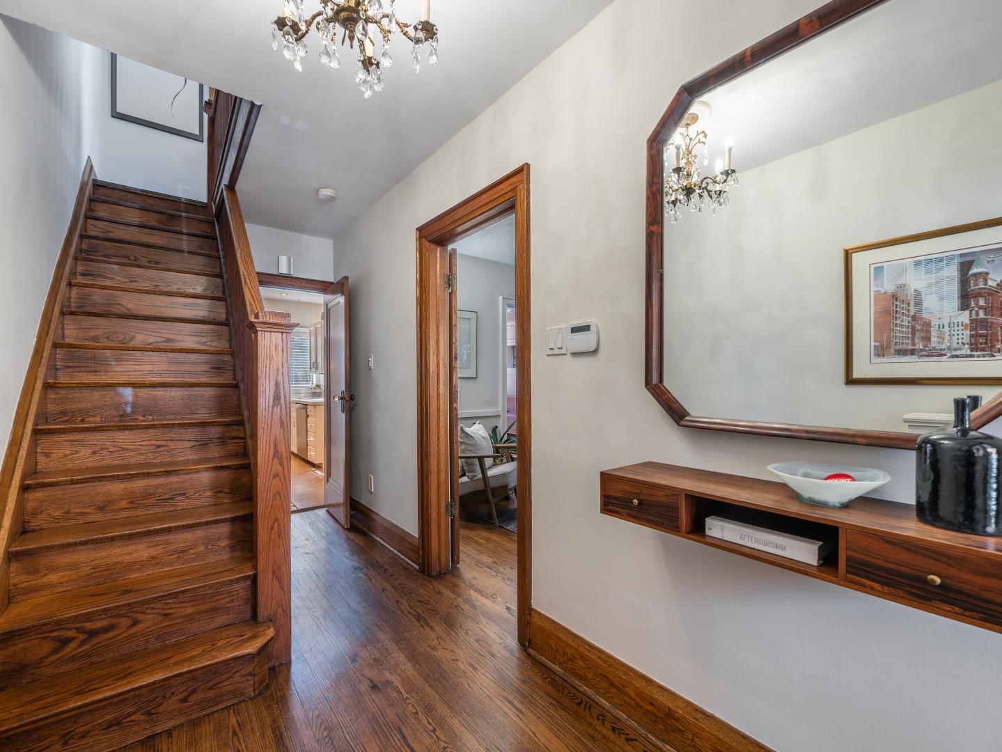 The main floor layout is traditional in style and offers spacious principle rooms. The living room features hardwood floor, gas fireplace and original stained glass windows. The dining room has beautiful natural light that streams through the custom glass sliding door. Other classic features include the plate rail wall moulding and stained glass window. A pocket door separates the dining room from the renovated kitchen. Heated tile floors, stainless steel appliances and quartz countertops are some of the recent upgrades to this functional space.
