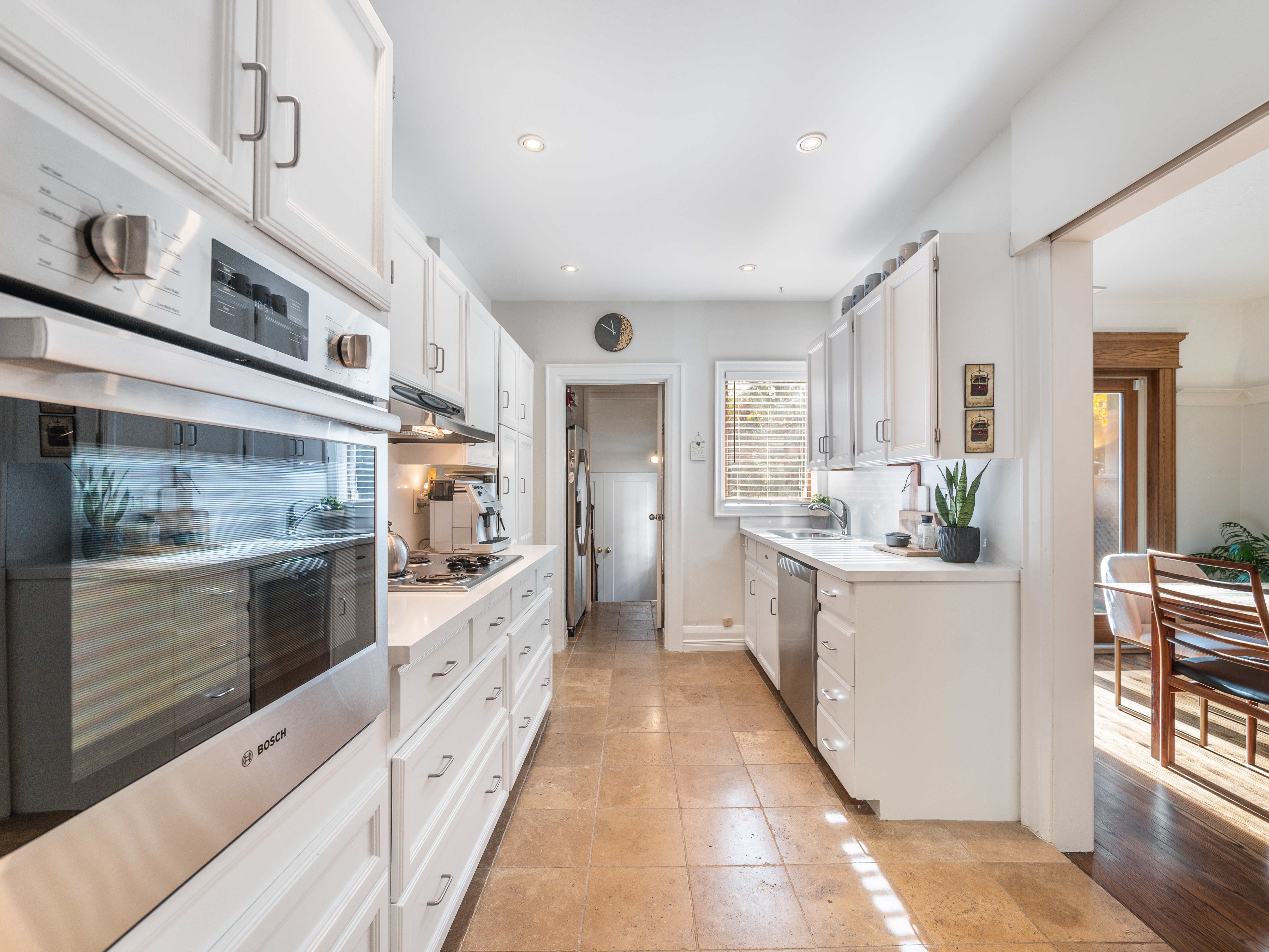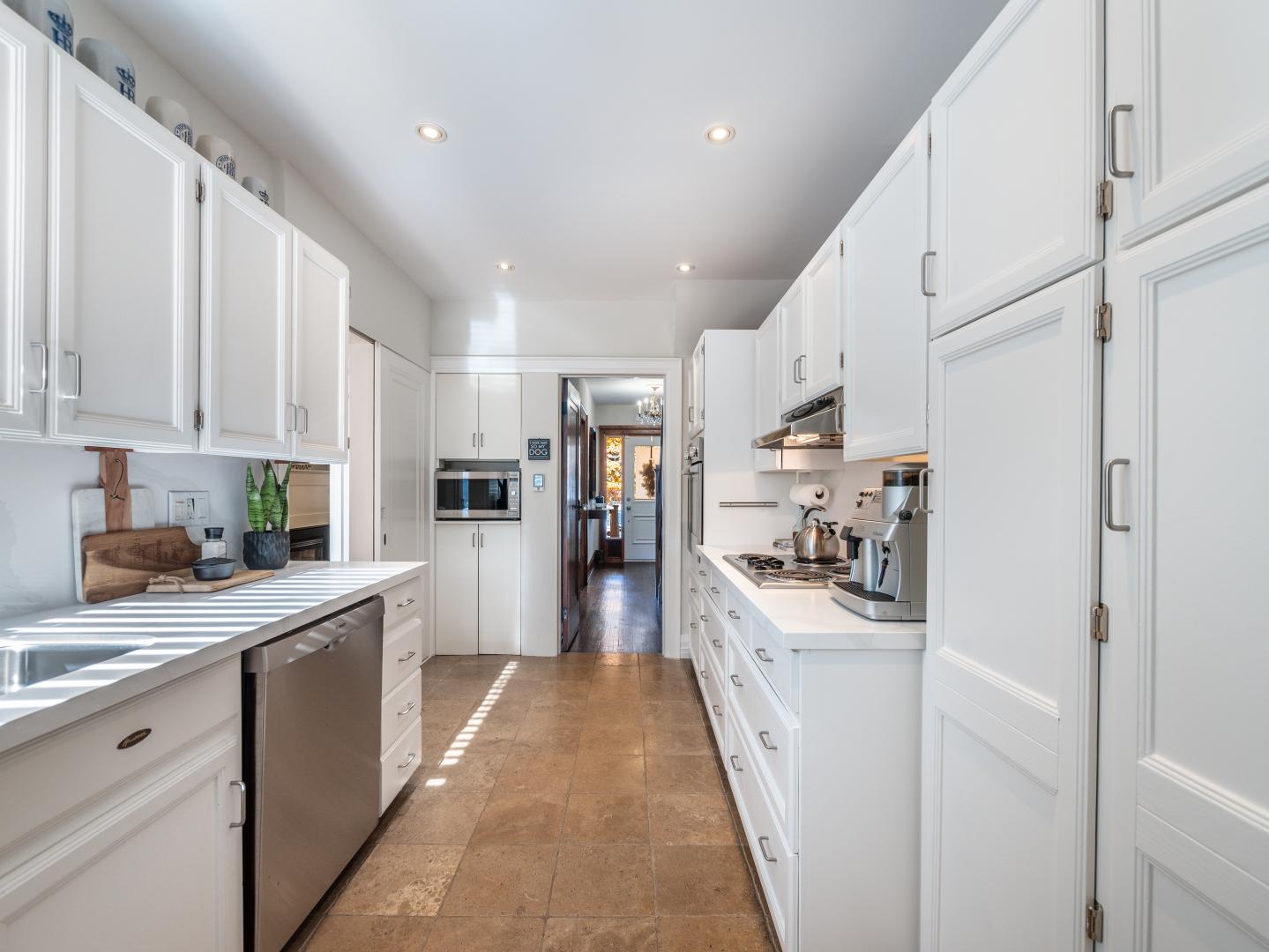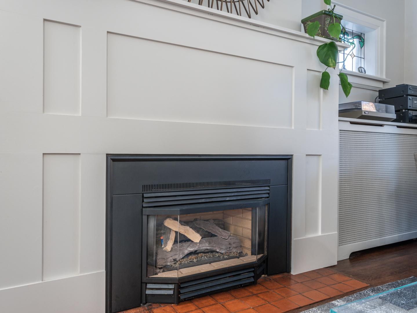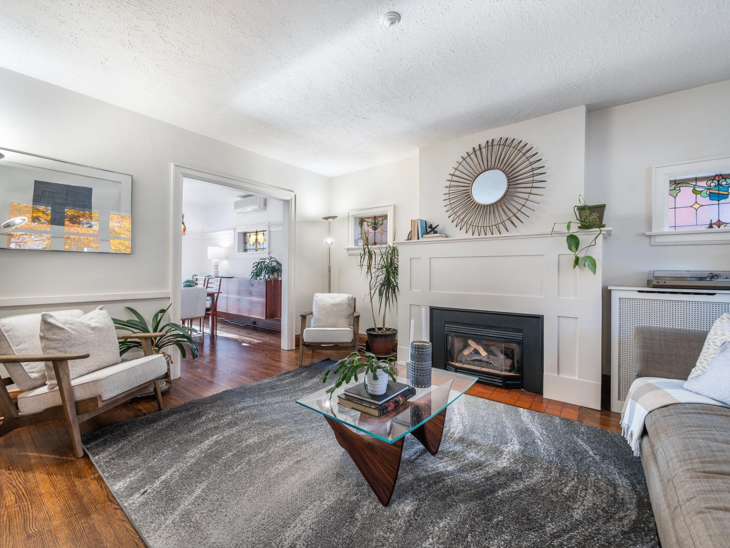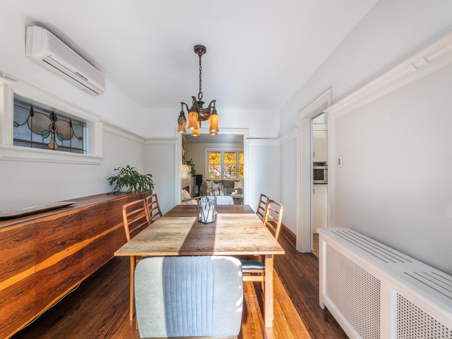 The main floor layout is traditional in style and offers spacious principle rooms. The living room features hardwood floor, gas fireplace and original stained glass windows. The dining room has beautiful natural light that streams through the custom glass sliding door. Other classic features include the plate rail wall moulding and stained glass window. A pocket door separates the dining room from the renovated kitchen. Heated tile floors, stainless steel appliances and quartz countertops are some of the recent upgrades to this functional space.