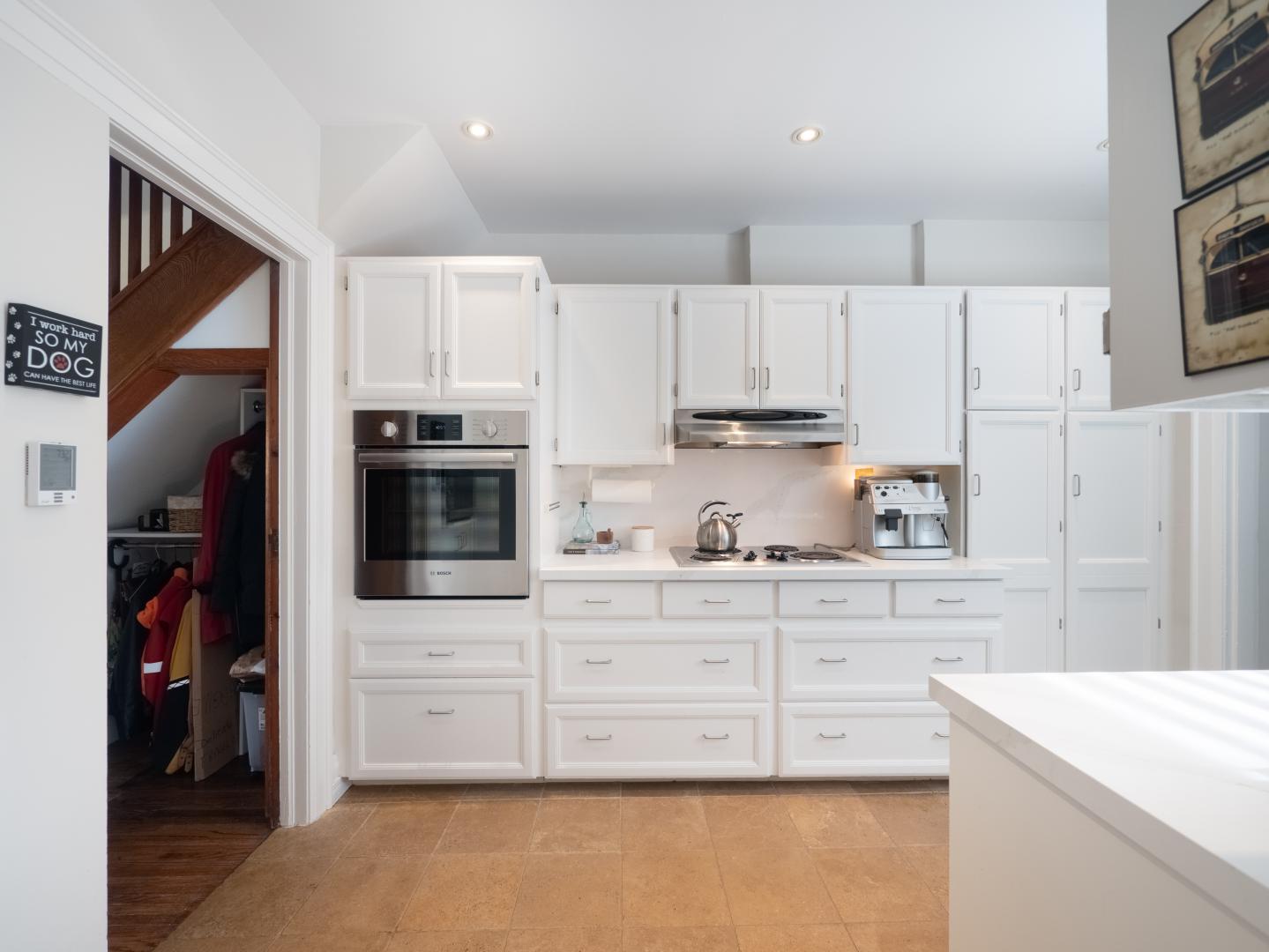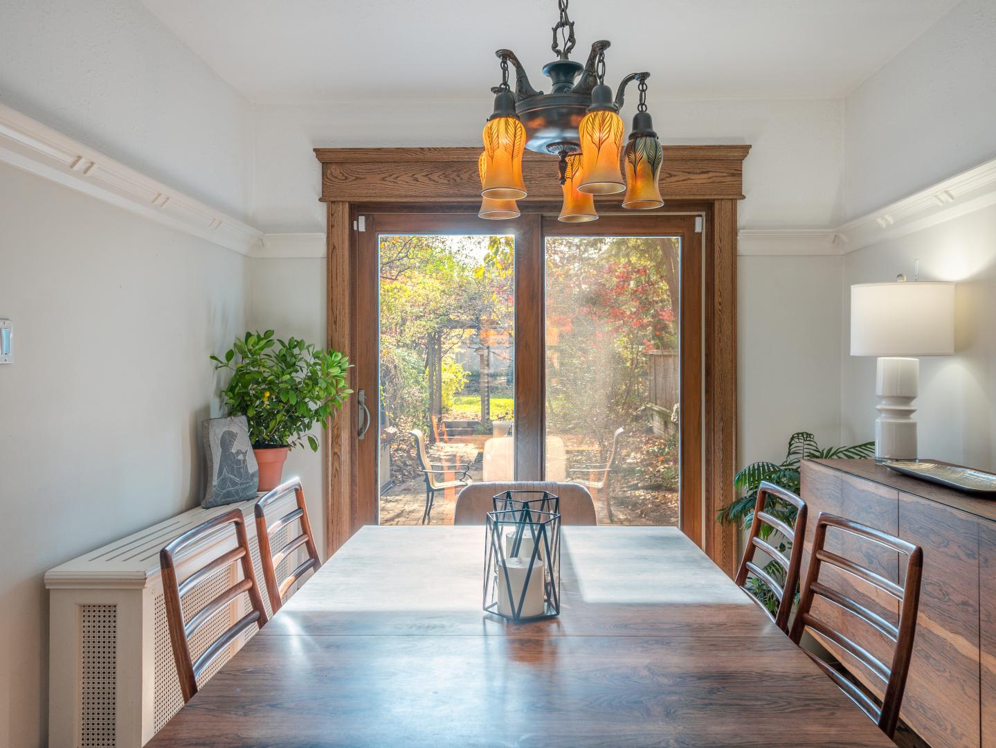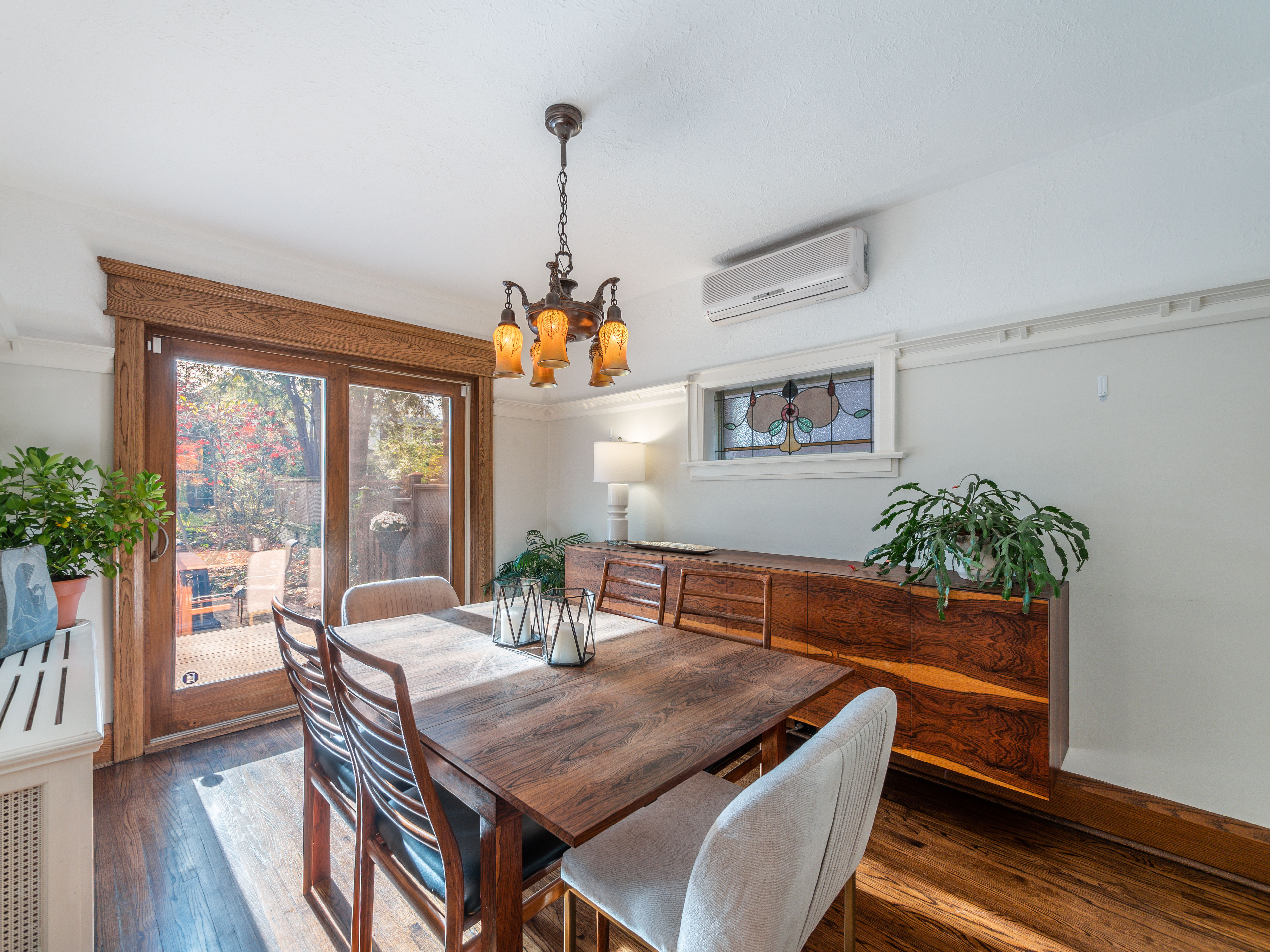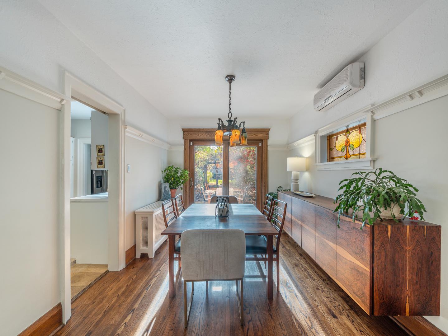 The main floor layout is traditional in style and offers spacious principle rooms. The living room features hardwood floor, gas fireplace and original stained glass windows. The dining room has beautiful natural light that streams through the custom glass sliding door. Other classic features include the plate rail wall moulding and stained glass window. A pocket door separates the dining room from the renovated kitchen. Heated tile floors, stainless steel appliances and quartz countertops are some of the recent upgrades to this functional space.