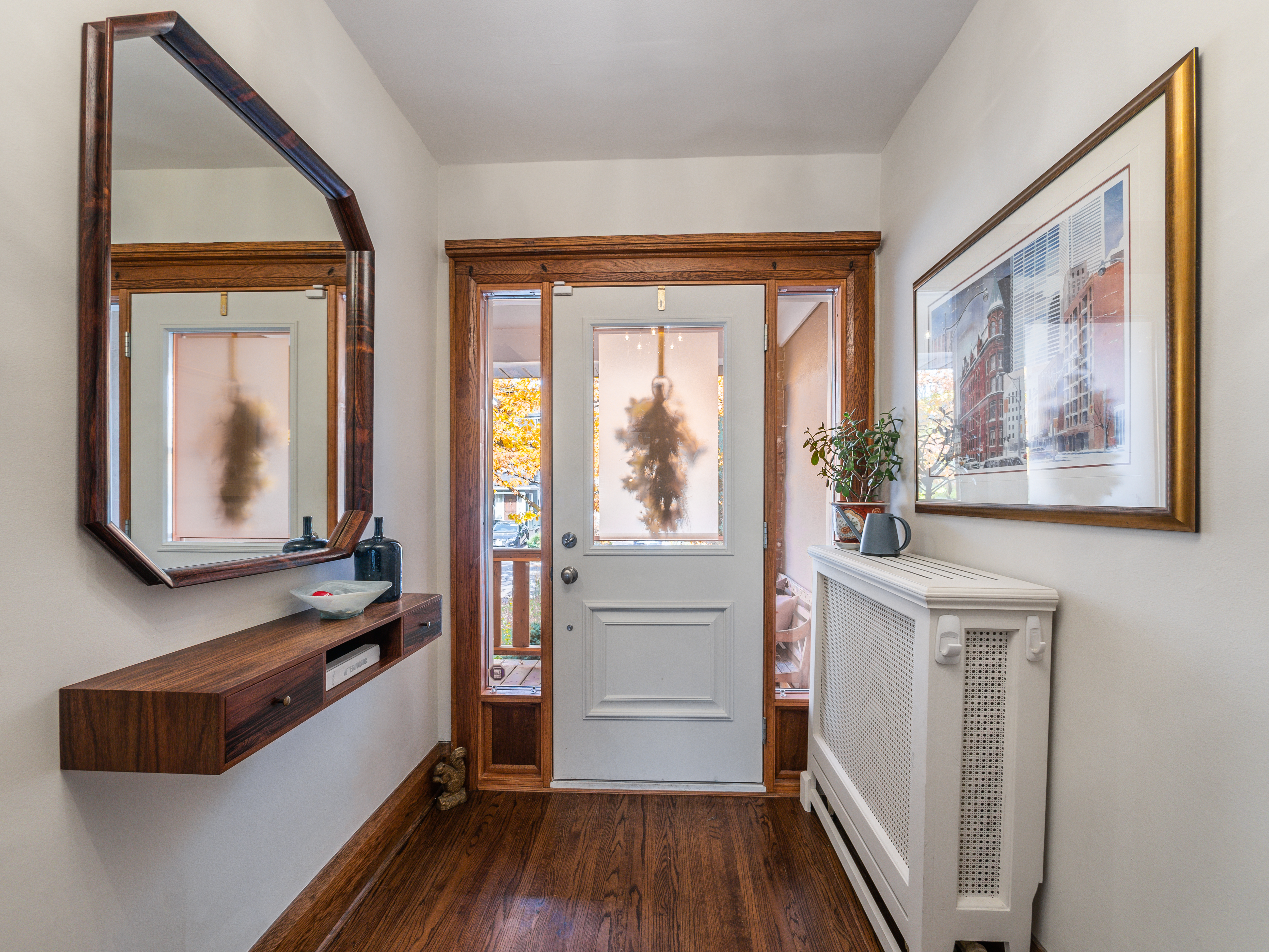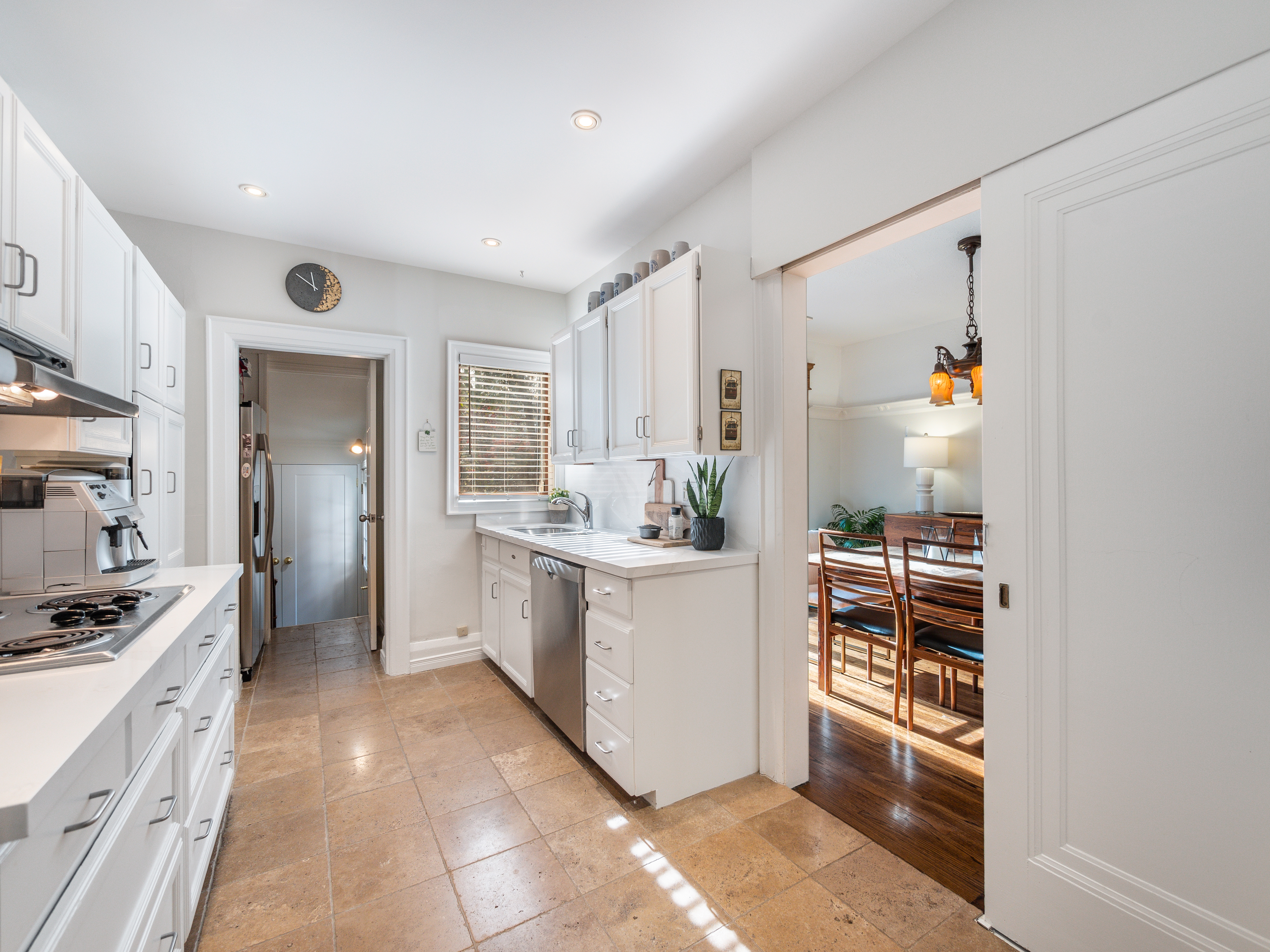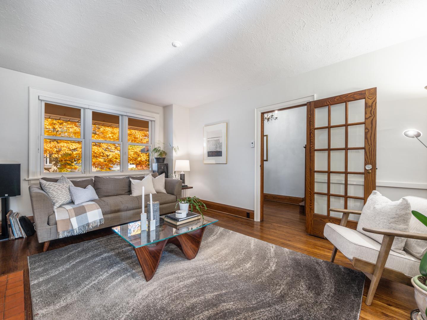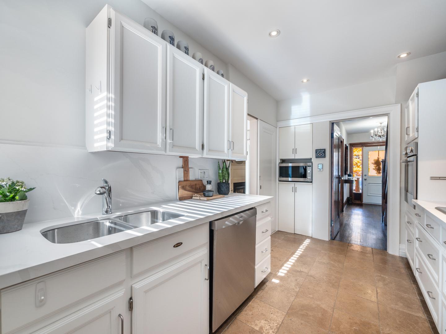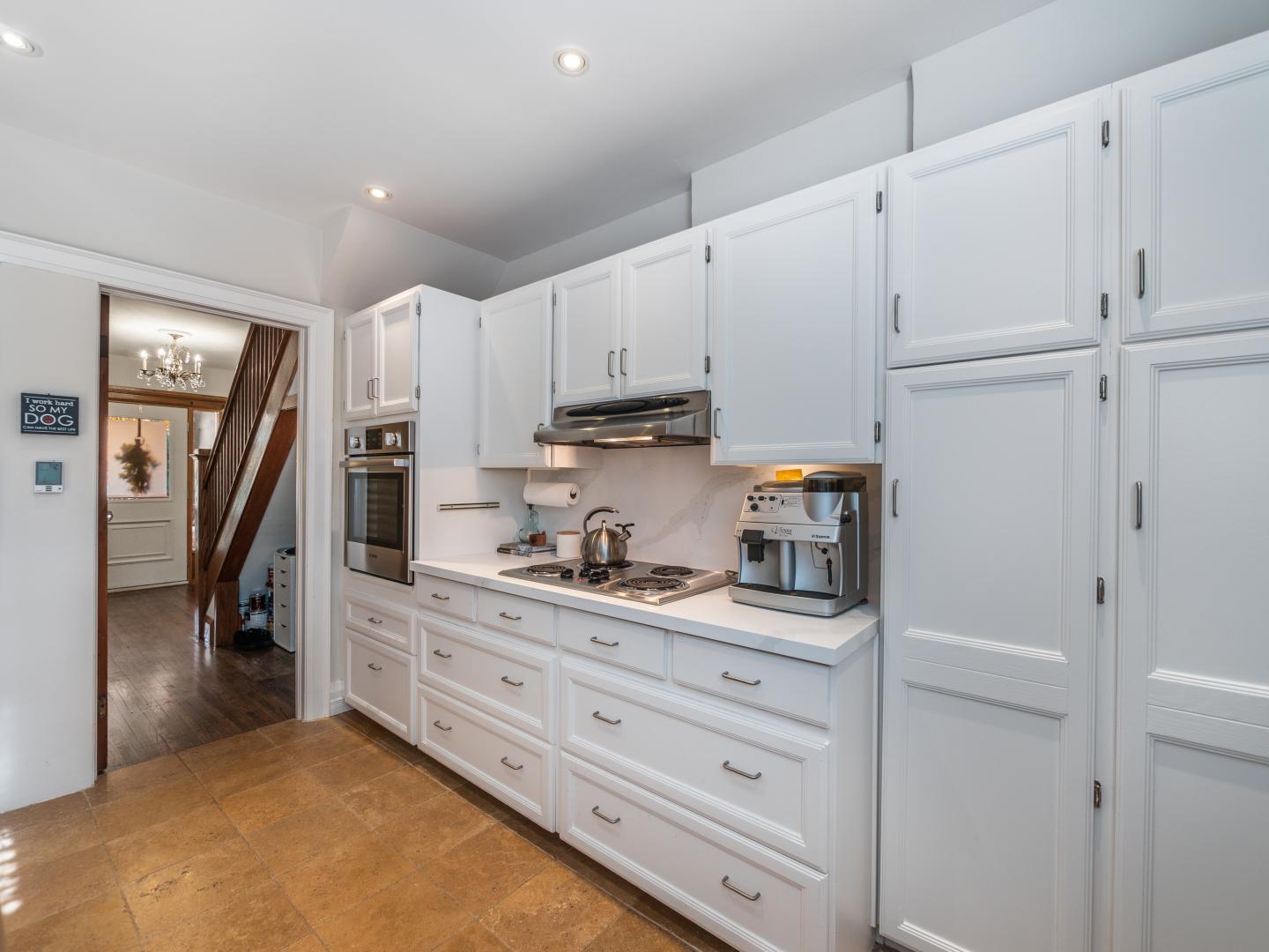 The main floor layout is traditional in style and offers spacious principle rooms. The living room features hardwood floor, gas fireplace and original stained glass windows. The dining room has beautiful natural light that streams through the custom glass sliding door. Other classic features include the plate rail wall moulding and stained glass window. A pocket door separates the dining room from the renovated kitchen. Heated tile floors, stainless steel appliances and quartz countertops are some of the recent upgrades to this functional space.