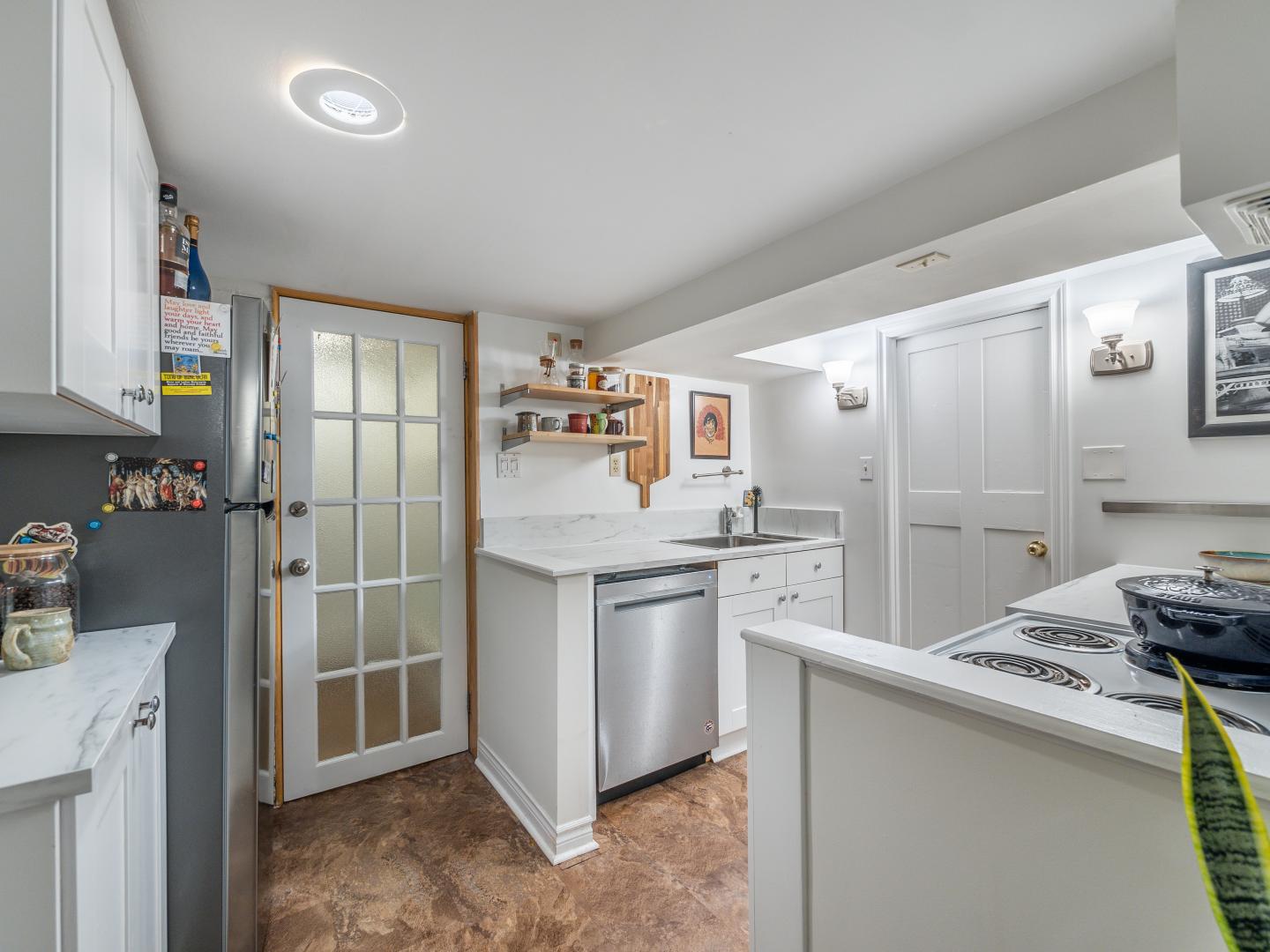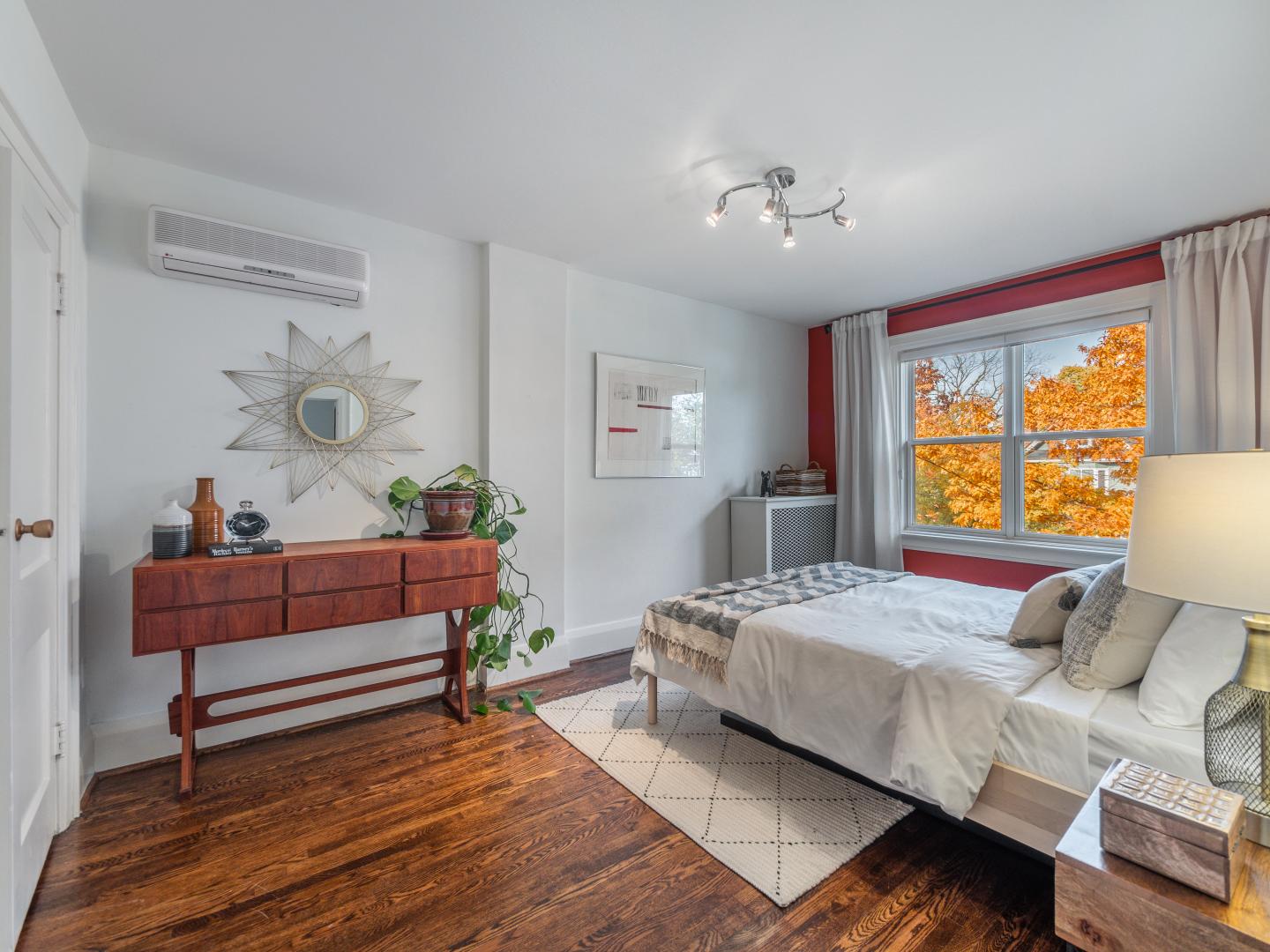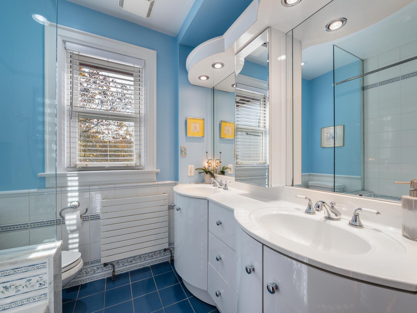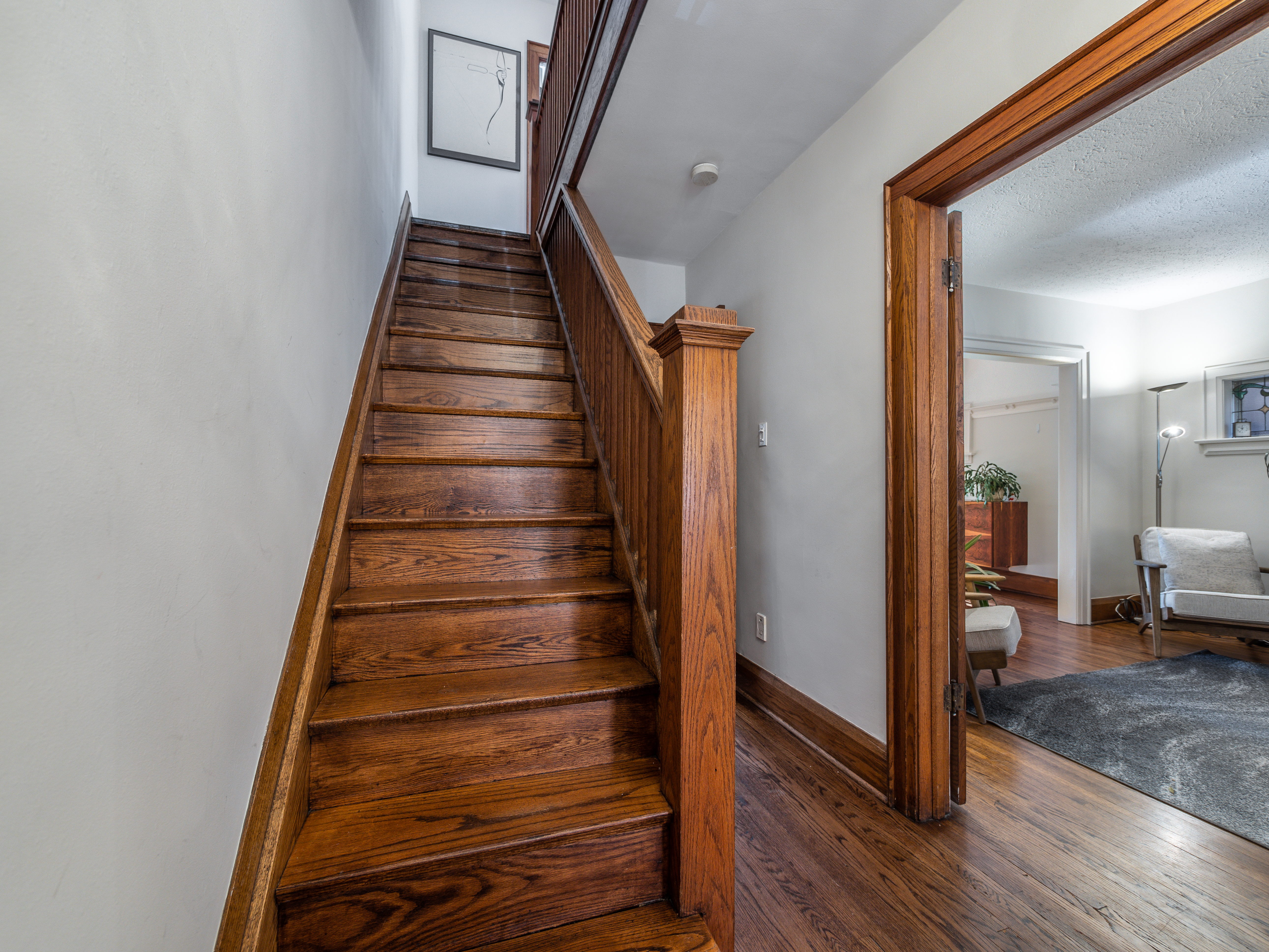 The main floor layout is traditional in style and offers spacious principle rooms. The living room features hardwood floor, gas fireplace and original stained glass windows. The dining room has beautiful natural light that streams through the custom glass sliding door. Other classic features include the plate rail wall moulding and stained glass window. A pocket door separates the dining room from the renovated kitchen. Heated tile floors, stainless steel appliances and quartz countertops are some of the recent upgrades to this functional space.